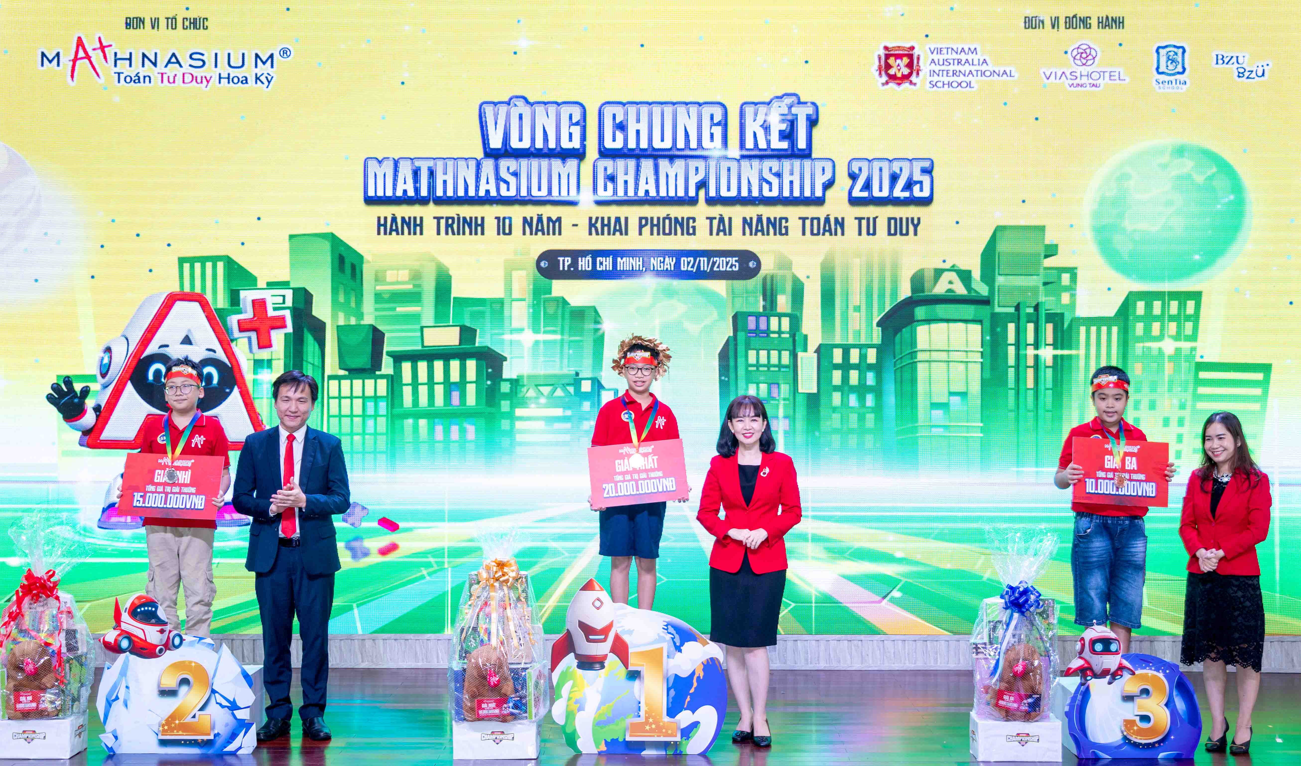 (THPL) - Vượt qua hàng ngàn thí sinh trên toàn quốc, ngày 02/11/2025, 289 thí sinh xuất sắc đã bước vào vòng Chung kết cuộc thi Mathnasium Championship 2025- Hành trình 10 năm Khai phóng tài năng Toán tư duy khu vực Miền Nam được tổ chức tại TP. Hồ Chí Minh. Kết quả cuối cùng, 18 thí sinh xuất sắc nhất đã được chọn để trao giải Nhất, Nhì, Ba.
