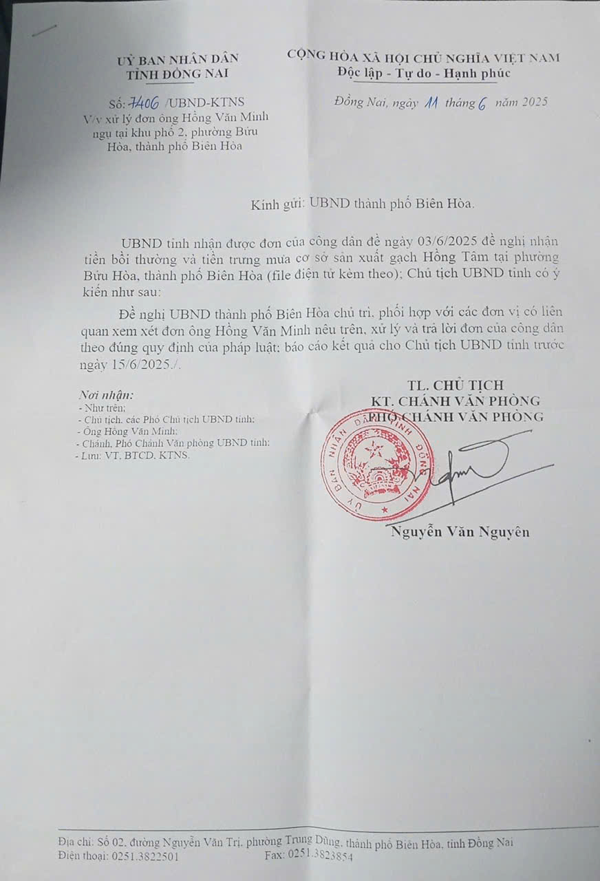 Mới đây, ông Minh tiếp tục khiếu nại ở địa phương thì UBND tỉnh Đồng Nai ngày 11/06/2025 ra công văn số 7406/UBND-KTNS “Đề nghị UBND thành phố Biên Hòa chủ trì, phối hợp với các đơn vị có liên quan xem xét đơn ông Hồng Văn Minh nêu trên, xử lý và trả lời đơn của công dân theo đúng quy định của pháp luật, báo cáo kết quả cho Chủ tịch UBND tỉnh trước ngày 15/06/2025”.