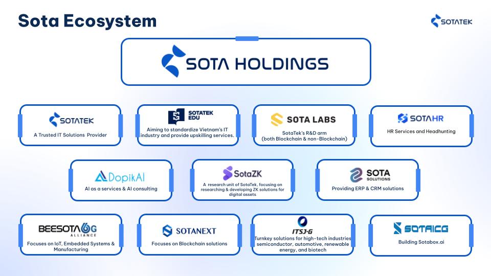 SotaTek Education – đơn vị đầu tiên tại Việt Nam hợp tác với YBM (Hàn Quốc) triển khai chứng chỉ lập trình quốc tế COS ProNgoài ra, hệ sinh thái còn bao gồm những thành viên đáng chú ý khác như SotaICG và DopikAI – hai đơn vị Ứng dụng AI trong dầu khí, sản xuất và dịch vụ khách hàng; BEESOTA6G Alliance chuyên nghiên cứu viễn thông 6G; SotaNext và ITSJ-G với các sản phẩm blockchain và phần mềm doanh nghiệp; Sota Solutions cung cấp hệ thống ERP và CRM giúp tối ưu hoá vận hành.