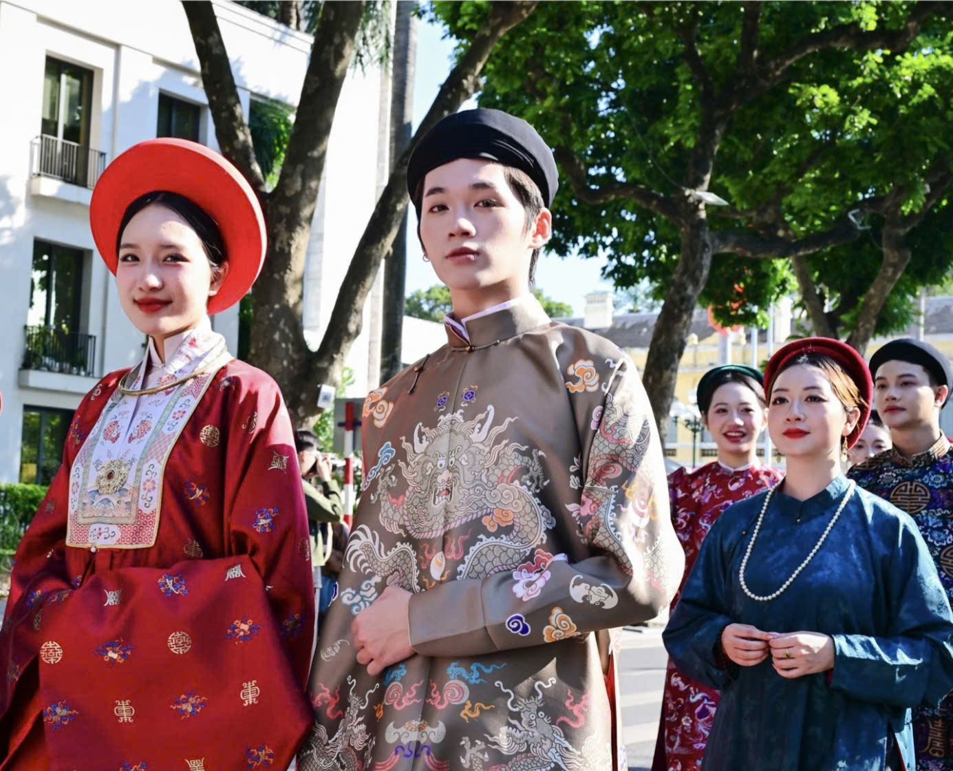Ngoài ra, 200 thành viên Câu lạc bộ Di sản Áo dài Việt Nam đã mang đến màn trình diễn đầy cảm xúc. Những tà áo dài truyền thống hòa cùng cổ phục uyển chuyển giữa sắc thu vàng, tạo nên hình ảnh rực rỡ, tôn vinh vẻ đẹp của phụ nữ Hà Nội và bản sắc văn hóa của dân tộc.