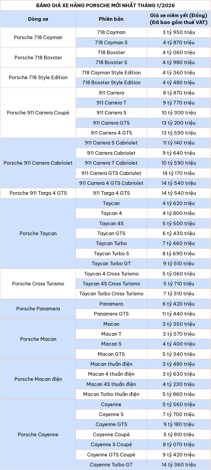 Dưới đây là bảng giá xe hãng Porsche mới nhất tháng 1/2026. (Nguồn: Porsche Việt Nam)