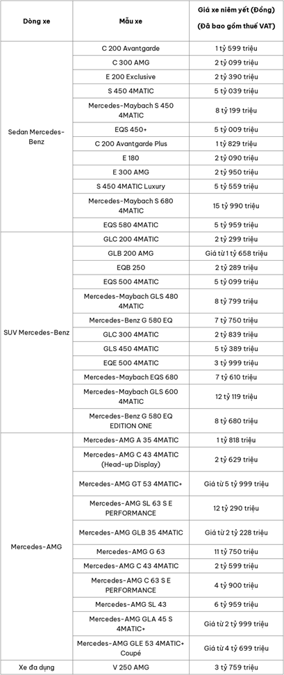 Dưới đây là bảng giá xe ô tô hãng Mercedes mới nhất tháng 6/2025: