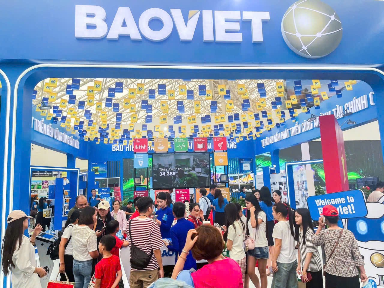 Tại sảnh 2 Nhà Triển lãm Kim Quy, gian hàng của Bảo Việt mang đến một không gian trải nghiệm mở, hiện đại, vừa tái hiện dấu ấn lịch sử 60 năm vừa thể hiện khát vọng tương lai. Chủ đề xuyên suốt là “Phát triển bền vững”, thể hiện cam kết đồng hành cùng dân tộc vươn mình mạnh mẽ trong kỷ nguyên hội nhập.