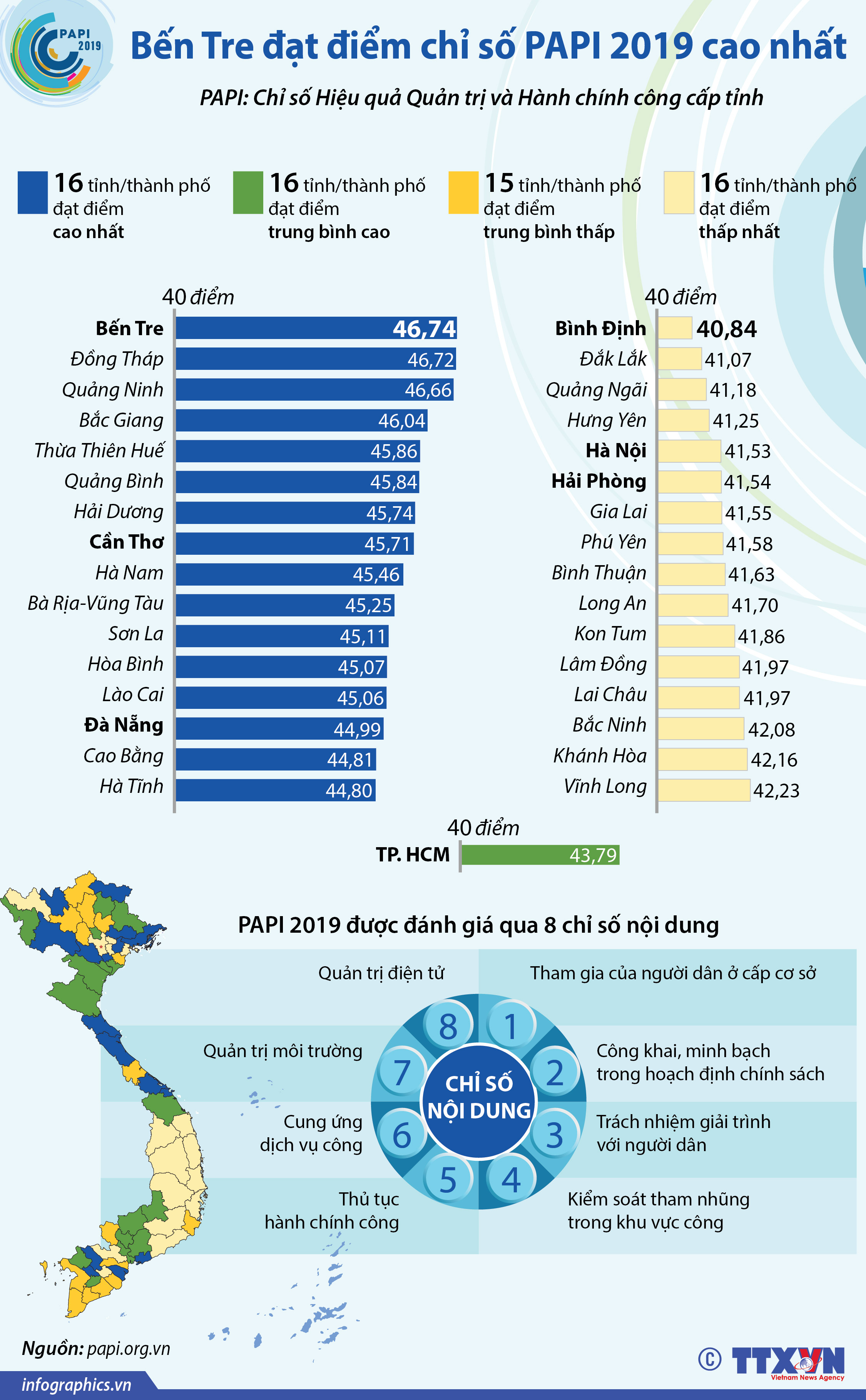 Theo báo Giáo dục thời đại, ba thứ hạng cao nhất trong PAPI 2019 lần lượt là Bến Tre, Đồng Tháp và Quảng Ninh mức điểm tổng hợp cao nhất trên 46,6 điểm. Bến Tre tiếp tục có điểm cao nhất là 46,74 điểm, với 7 chỉ số thành phần có điểm ở mức cao nhất, trừ chỉ số chính phủ điện tử có điểm trong nhóm thấp. Nhưng mức điểm này thấp hơn điểm của chính Bến Tre tại PAPI 2018. Năm ngoái, Bến Tre đạt 47,5 điểm. Có thể thấy, khoảng cách với điểm tối đa (80 điểm) trong PAPI 2019 lại nới rộng ra.