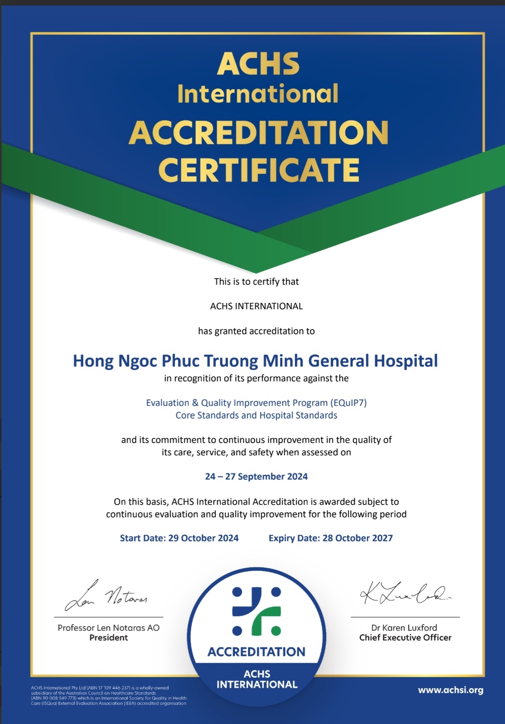 Ngày 28/02 vừa qua, Bệnh viện Đa khoa Hồng Ngọc tổ chức Lễ đón nhận Chứng chỉ chất lượng Bệnh viện theo tiêu chuẩn của ACHS International, trở thành Bệnh viện đa khoa đầu tiên tại Việt Nam chinh phục thành công Chứng chỉ danh giá này theo Bộ tiêu chí EQuIP7 cùng mức đánh giá cao nhất - ACCREDITATION.