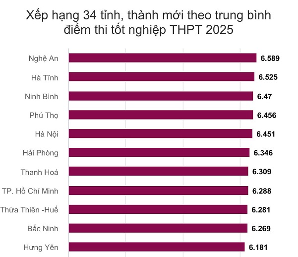 Xét theo 34 tỉnh, thành mới, Nghệ An đứng đầu với điểm trung bình 6,589, kế đó là Hà Tĩnh với 6.525. Đây là hai tỉnh không thực hiện sáp nhập, lần lượt có khoảng 39.000 và 17.000 thí sinh thi tốt nghiệp.