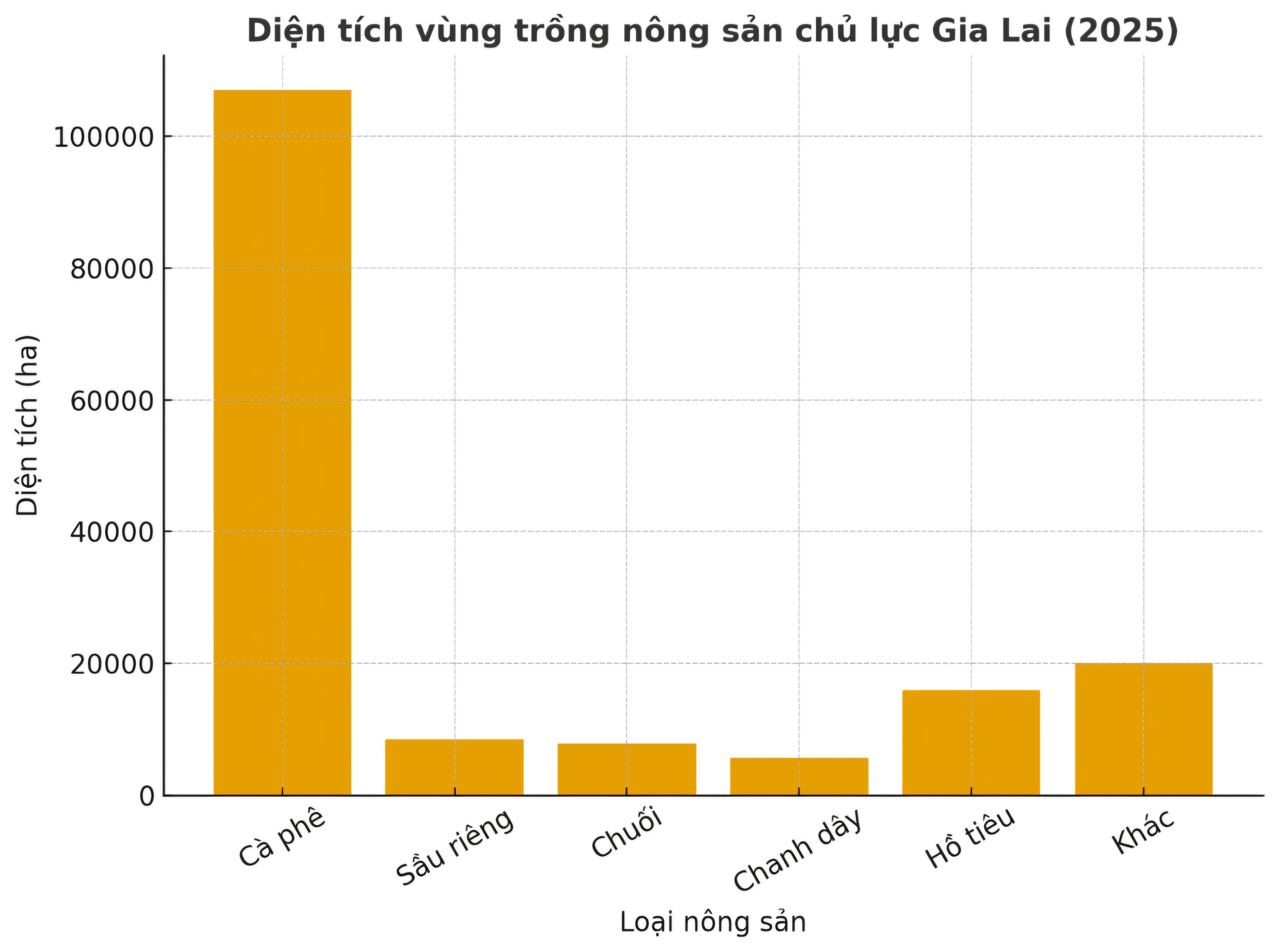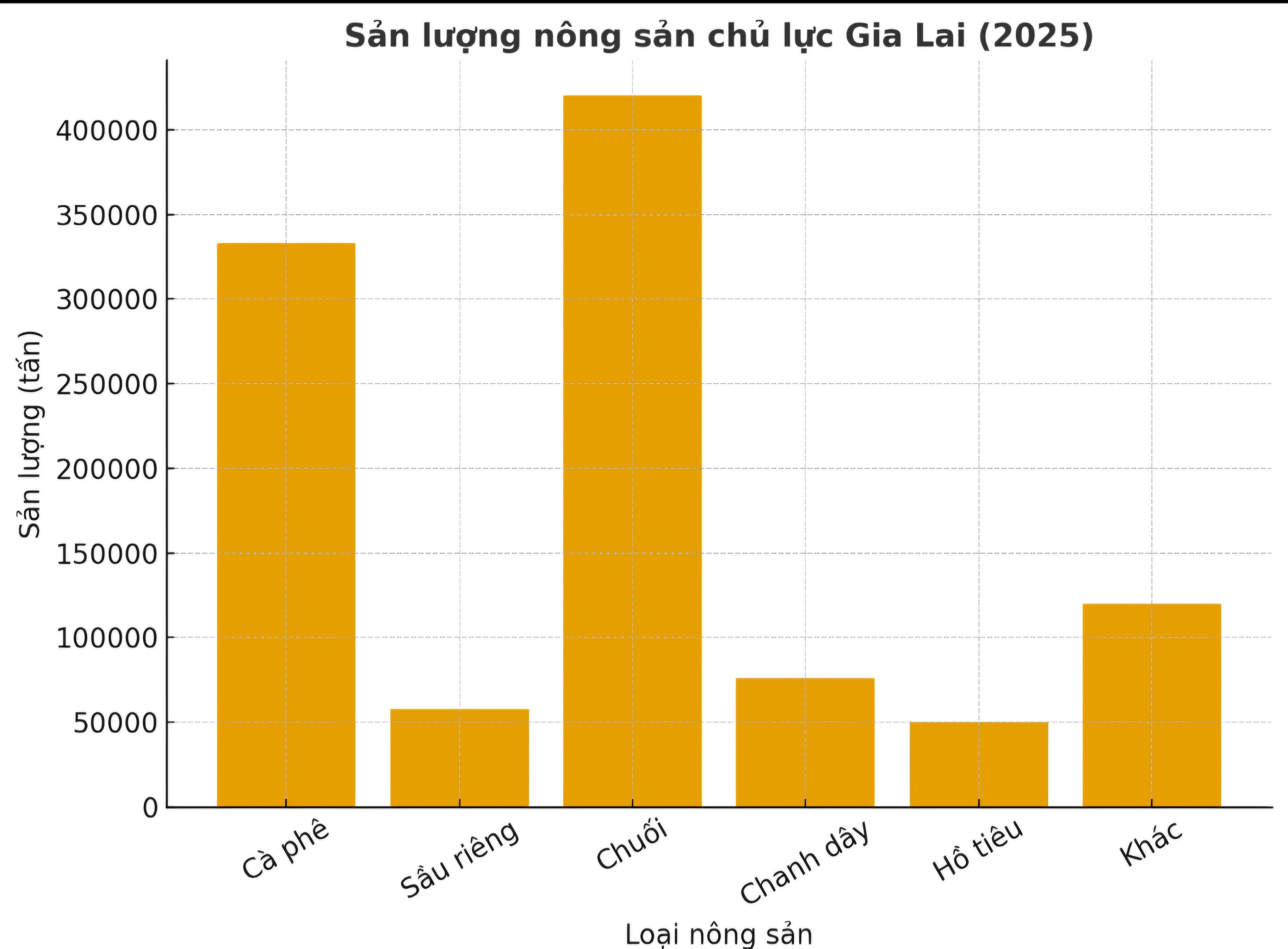 Gia Lai có hơn 1,4 triệu ha đất nông nghiệp, nhiều vùng đất đỏ bazan thích hợp với các cây công nghiệp dài ngày như cà phê, hồ tiêu, dừa, sầu riêng… Sản lượng và diện tích sản xuất lớn: Ví dụ, cà phê hơn 107.000 ha với sản lượng nhân hơn 333.000 tấn; sầu riêng 8.500 ha sản lượng ~57.700 tấn; chuối 7.850 ha; chanh dây 5.650 ha.