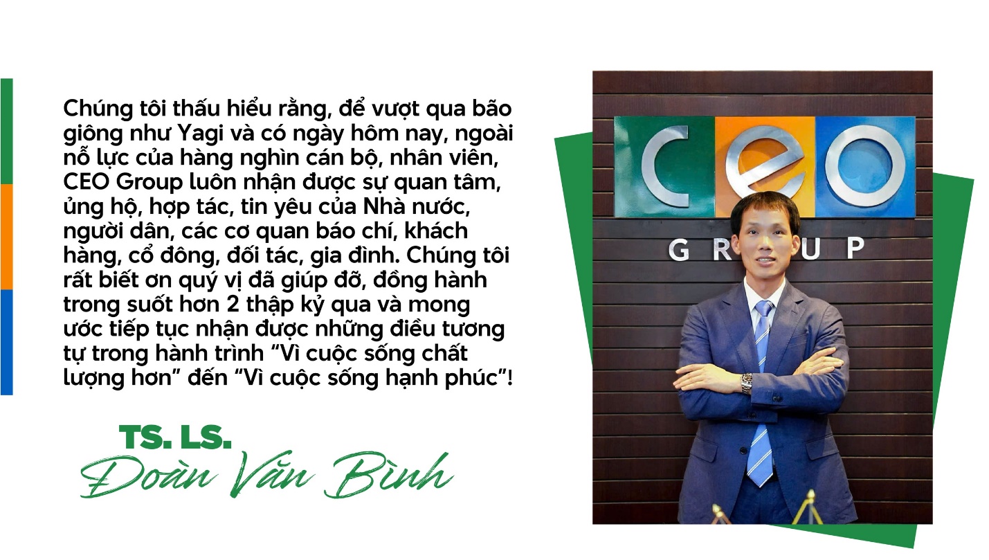 Không dừng lại ở đó, Chủ tịch Đoàn Văn Bình cho biết, trong thời gian tới, Tập đoàn CEO sẽ đầu tư mạnh mẽ vào một số thị trường mới như dịch vụ chăm sóc sức khỏe, lĩnh vực giáo dục có hệ thống trường liên cấp… Đồng thời, nghiên cứu và mở rộng các ngành kinh doanh mới phù hợp với mục tiêu lâu dài của Tập đoàn.
