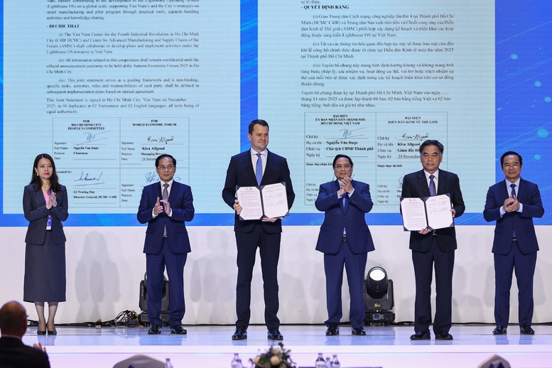 Chiều ngày 26/11, tại TP.HCM, sự kiện tâm điểm, điểm nhấn đặc biệt trong chương trình Diễn đàn Kinh tế mùa Thu năm 2025 - phiên đối thoại chính sách cấp cao giữa Thủ tướng Chính phủ Phạm Minh Chính với lãnh đạo Diễn đàn Kinh tế Thế giới đã diễn ra về chủ đề "Chuyển đổi kép từ chiến lược đến hành động - Định hình Việt Nam trong kỷ nguyên vươn mình".