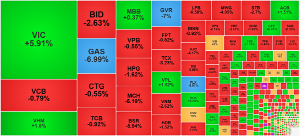 Trong bối cảnh thị trường đỏ lửa, nhóm cổ phiếu liên quan đến tập đoàn Vingroup trở thành "cứu cánh" quan trọng giúp VN-Index không giảm sâu hơn. VIC tăng mạnh 5,91%, VHM tăng 1,6% và VPL tăng 1,62%. Theo tính toán, riêng bộ ba này đã đóng góp khoảng 17-18 điểm cho chỉ số, trong đó VIC đóng góp tới 16 điểm. Nếu không có lực đỡ này, VN-Index có thể đã mất thêm hơn 17 điểm.