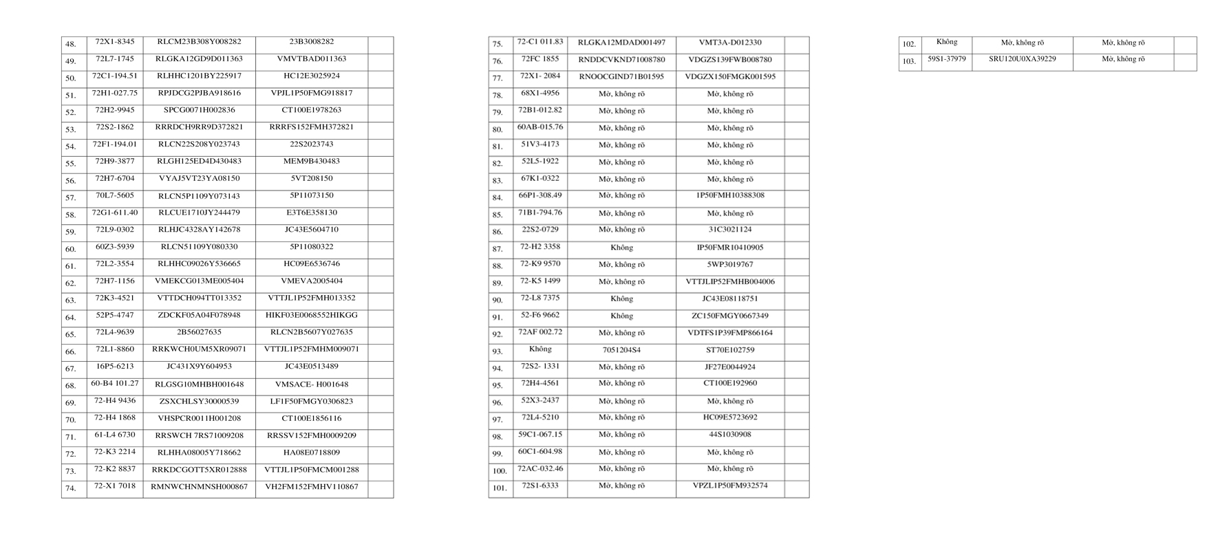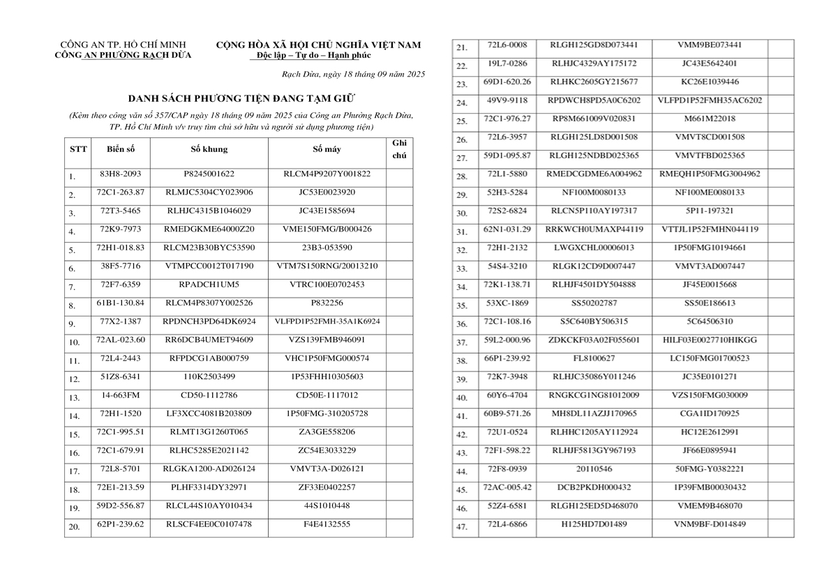 Địa chỉ liên hệ: Tổ Phòng chống tội phạm - Công an phường Rạch Dừa, số 286 đường 30/4, phường Rạch Dừa, TP. Hồ Chí Minh. Người phụ trách: Đồng chí Trương Thị Ánh Tuyết (SĐT: 0905.246.391). Danh sách cụ thể 103 phương tiện đã được công khai để người dân tiện tra cứu.