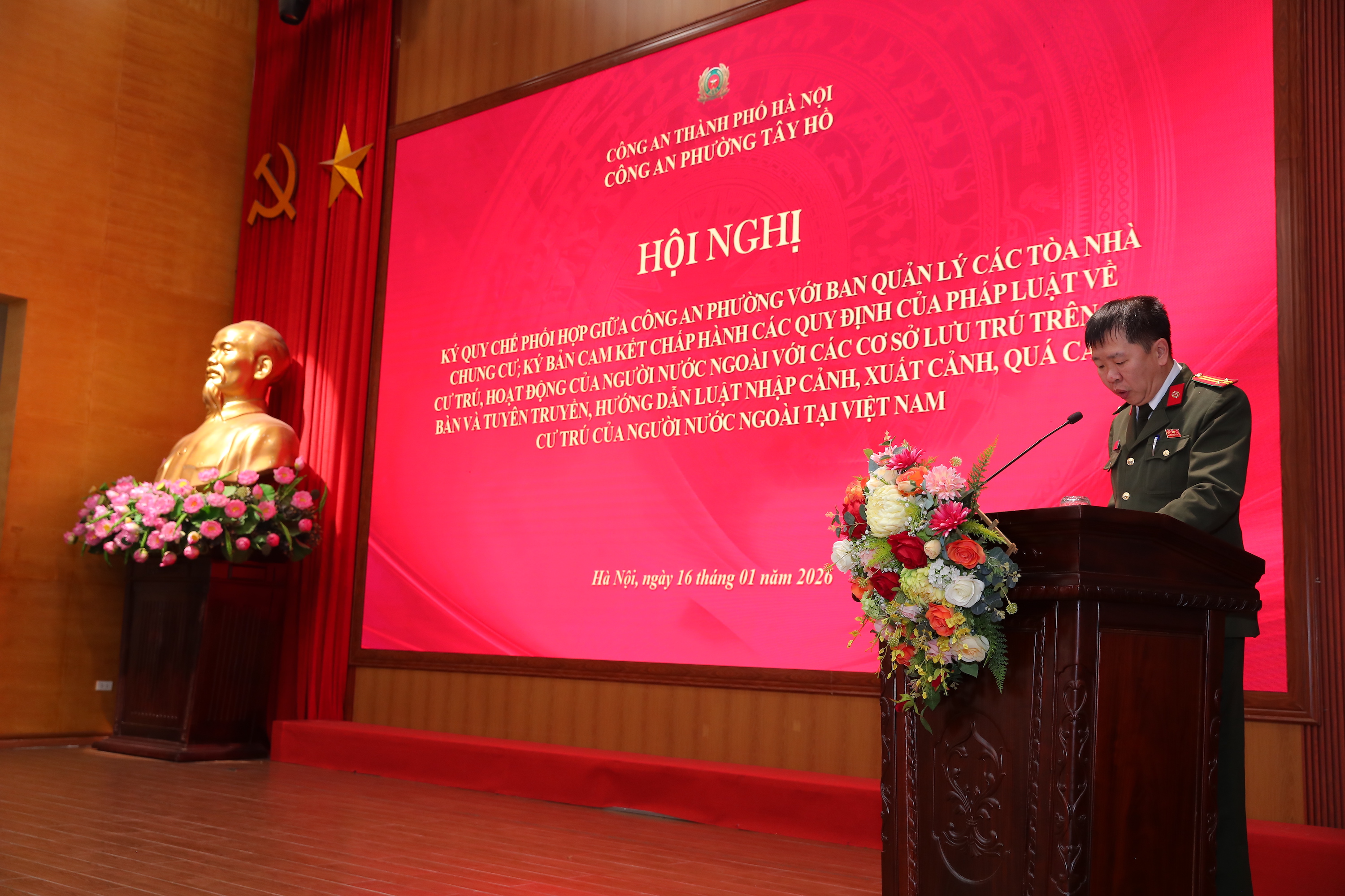 (THPL) - Ngày 16/01/2026, Công an phường Tây Hồ đã tổ chức Hội nghị ký kết quy chế phối hợp với Ban quản lý các tòa nhà chung cư và ký cam kết chấp hành pháp luật về cư trú đối với người nước ngoài. Đây là bước đi quan trọng nhằm tạo sự đồng bộ, nâng cao trách nhiệm của các cơ sở lưu trú trong việc bảo đảm an ninh trật tự tại địa bàn có tốc độ đô thị hóa nhanh và đông người nước ngoài sinh sống.