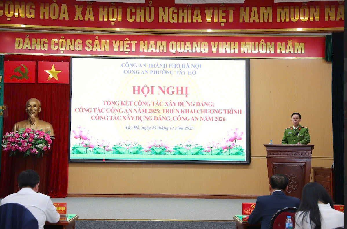 (THPL) - Chiều 15h00 ngày 19/12/2025, Công an phường Tây Hồ – Công an thành phố Hà Nội tổ chức Hội nghị tổng kết công tác xây dựng Đảng, xây dựng lực lượng; công tác kiểm tra, giám sát năm 2025 và triển khai nhiệm vụ trọng tâm năm 2026, gắn với thực hiện phong trào thi đua “Kỷ luật nhất – Gần dân nhất – Vì Nhân dân phục vụ”.