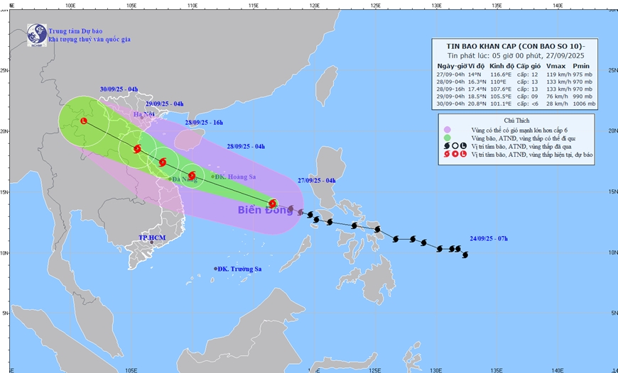 Theo dự báo của Trung tâm dự báo khí tượng thủy văn quốc gia, trong 2 ngày tới bão số 10 sẽ tiếp tục mạnh thêm lên cấp 12-13, giật cấp 16, di chuyển rất nhanh về phía vùng biển và đất liền khu vực Bắc Trung Bộ và Bắc Bộ nước ta, càng vào gần bờ biển nước ta bão càng mạnh lên. Do ảnh hưởng của bão, tại vùng biển từ Thanh Hóa đến Quảng Ngãi từ chiều tối 27/9 gió sẽ mạnh dần lên cấp 6-7, sau tăng lên cấp 8-9, vùng gần tâm bão cấp 10-13, giật cấp 16, sóng biển cao 5-7m, biển động dữ dội.