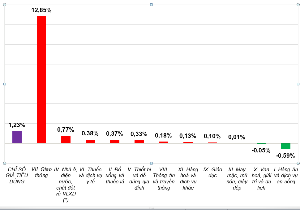 Trong tháng 3, có 9/11 nhóm hàng hóa tăng giá, trong đó tăng mạnh nhất là nhóm giao thông. Hai nhóm hàng giảm giá là lương thực thực phẩm và văn hóa, giải trí và du lịch. Riêng tháng 3, chỉ số giá nhóm giao thông tăng 12,85% so với tháng trước, tác động làm CPI chung tăng 1,28 điểm phần trăm, chủ yếu do giá xăng dầu tăng mạnh.