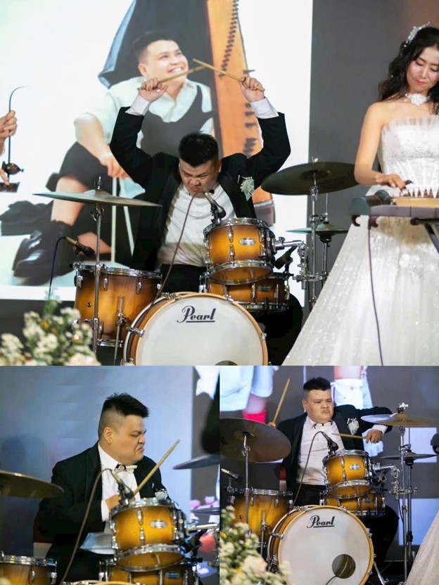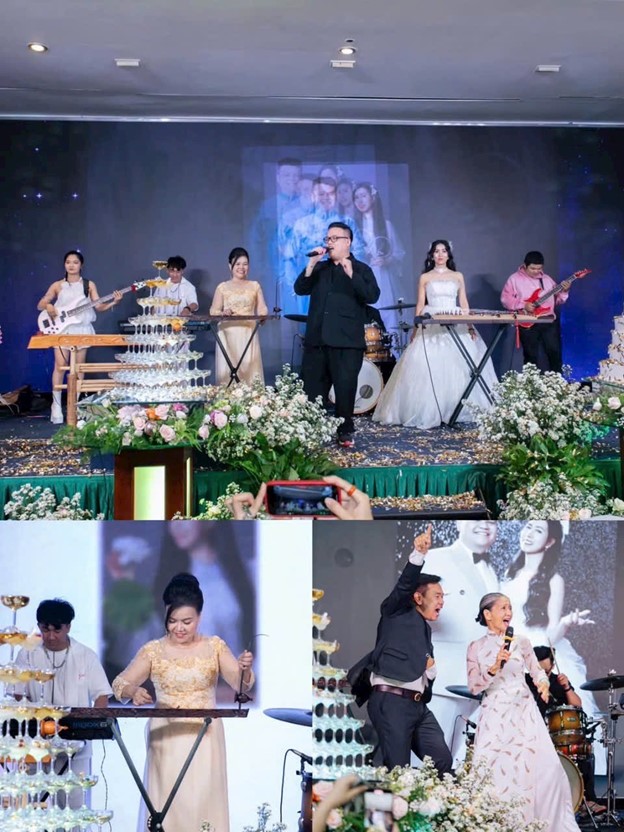 Không những vậy, danh tính của các nghệ sĩ “cây nhà lá vườn” này cũng không phải dạng vừa khiến dân tình bất ngờ. Theo đó, cô dâu và chú rể cùng hoạt động trong một nhóm nhạc kết hợp giữa nhạc cụ truyền thống Việt và nhạc cụ hiện đại. Do đó, đám cưới của cặp đôi quy tụ cả band nhạc lên trình diễn và cả những tiết mục từ người nhà đóng góp. Song, tất cả đều được đầu tư chỉn chu và hoành tráng.