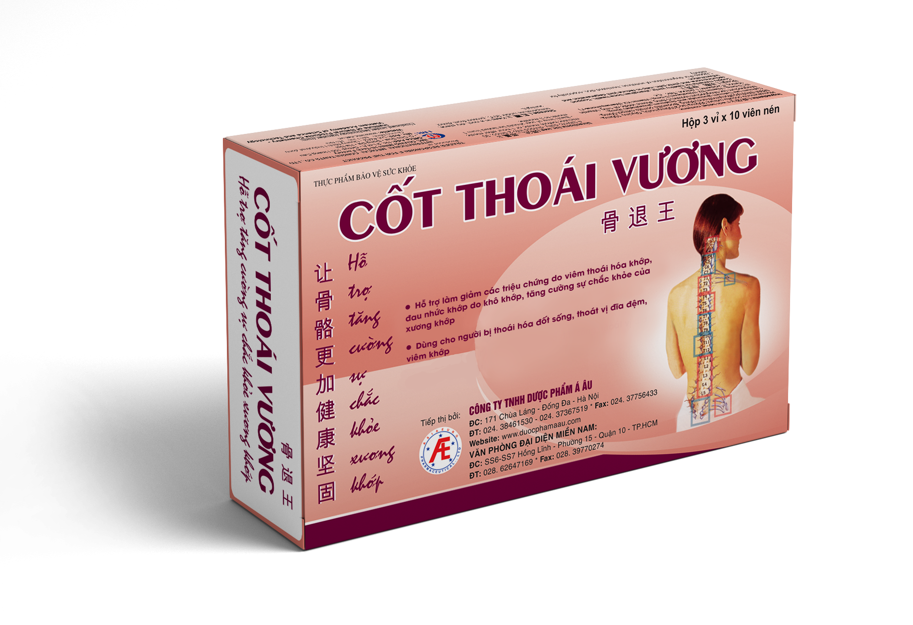 Thực phẩm bảo vệ sức khỏe Cốt Thoái Vương - Hỗ trợ tăng cường sự chắc khỏe xương khớp ![]() *Thành phần: Dầu vẹm xanh, cao thiên niên kiện, chiết xuất nhũ hương, MSM (Methylsulfonylmethane), Canxi, Glycine, Vitamin B1, B2, Magie, Vitamin K2. *Công dụng: - Hỗ trợ làm giảm các triệu chứng do viêm thoái hóa khớp, đau nhức khớp do khô khớp. - Bổ sung các dưỡng chất cần thiết cho khớp. - Hỗ trợ tăng cường sự chắc khỏe của xương khớp. *Đối tượng sử dụng: - Thích hợp với người bị thoái hóa đốt sống, thoát vị đĩa đệm, viêm khớp. *Hướng dẫn sử dụng: - Ngày uống 4 viên, chia làm 2 lần, 30 phút trước khi ăn hoặc sau ăn 1 giờ. - Mỗi đợt sử dụng nên kéo dài từ 3 đến 6 tháng. Tiếp thị và phân phối bởi: Công ty TNHH Dược phẩm Á Âu Á Âu - Địa chỉ an tâm, tin cậy, chất lượng suốt 20 năm. Địa chỉ: 171 Phố Chùa Láng - Phường Láng Thượng - Quận Đống Đa - Hà Nội. ĐT: 024.38461530 - 028.62647169. Giấy phép XNQC: 02496/2019/ATTP-XNQC. *Thực phẩm này không phải là thuốc và không có tác dụng thay thế thuốc chữa bệnh. *Sản phẩm được bán tại các nhà thuốc trên toàn quốc. |