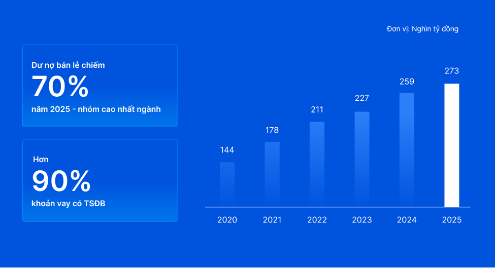 - Tín dụng bán lẻ 23%/năm — so với bình quân ngành 14%