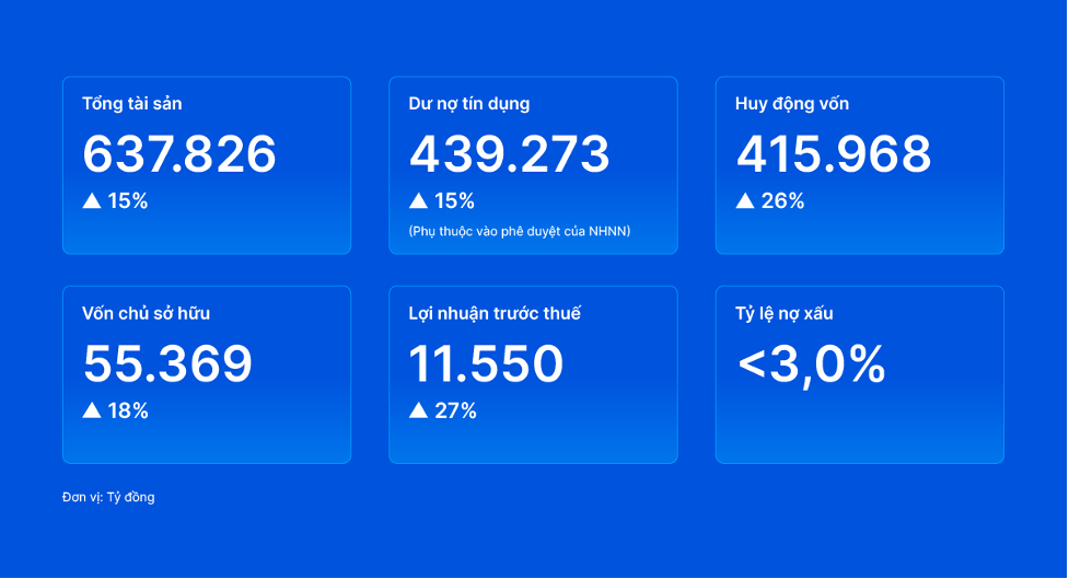 Năm 2025, tập trung nguồn lực cho sức mạnh dài hạn thông qua tăng mạnh trích lập dự phòng, củng cố nền tảng vốn và quản lý rủi ro, đầu tư mạnh mẽ vào công nghệ sản phẩm dịch vụ khối Ngân hàng Bán lẻ, Khách hàng Doanh nghiệp và Con người, kiện toàn nền móng cho giai đoạn tăng trưởng tiếp theo, VIB duy trì lợi nhuận trước thuế 9.105 tỷ đồng, tăng 1% so với năm 2024. Tính đến 31.12.2025, tổng tài sản VIB đạt 556 nghìn tỷ đồng, tăng 13% so với năm 2024, dư nợ tín dụng đạt 382 nghìn tỷ đồng, tăng 18%. Tiền gửi khách hàng và giấy tờ có giá đạt 330 nghìn tỷ đồng, tăng 10%.