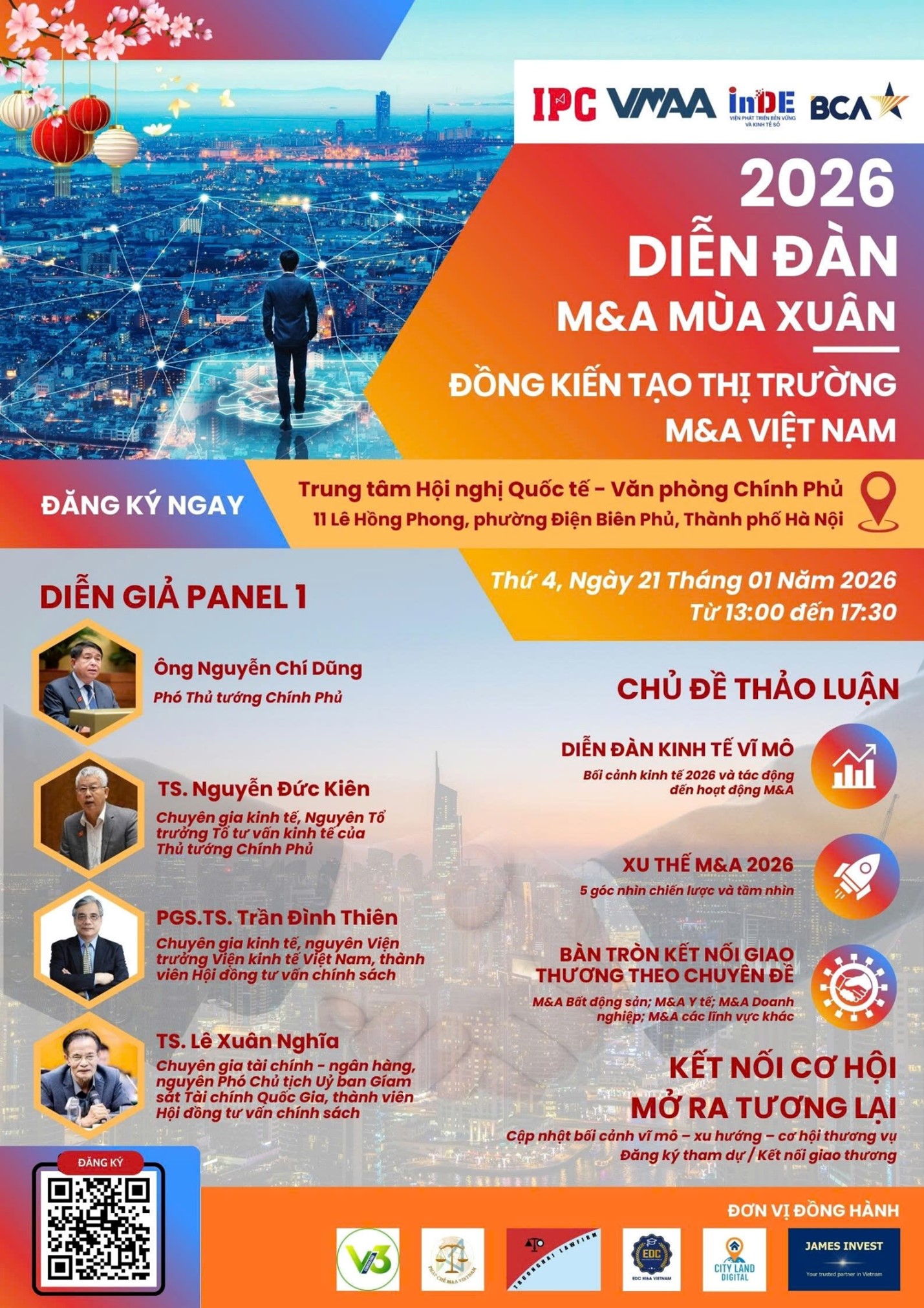 Diễn đàn diễn ra từ 13h00 đến 17h30, Thứ Tư, ngày 21/01/2026. Ban Tổ chức trân trọng mời các doanh nghiệp, nhà đầu tư, tổ chức tài chính, chuyên gia và cơ quan báo chí quan tâm đăng ký tham dự để cùng đồng kiến tạo thị trường M&A Việt Nam trong giai đoạn phát triển mới.