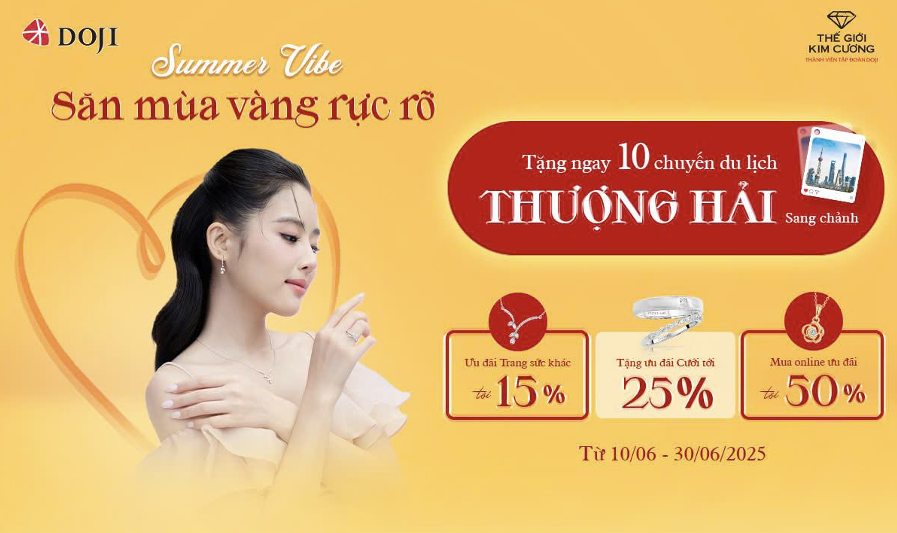 Không chỉ mang đến những thiết kế “gây thương nhớ”, DOJI và Thế Giới Kim Cương còn khiến tín đồ yêu cái đẹp không thể ngồi yên với chương trình khuyến mãi hấp dẫn “Summer Vibe - Săn mùa vàng rực rỡ” từ ngày 10/06 đến hết ngày 30/06/2025.