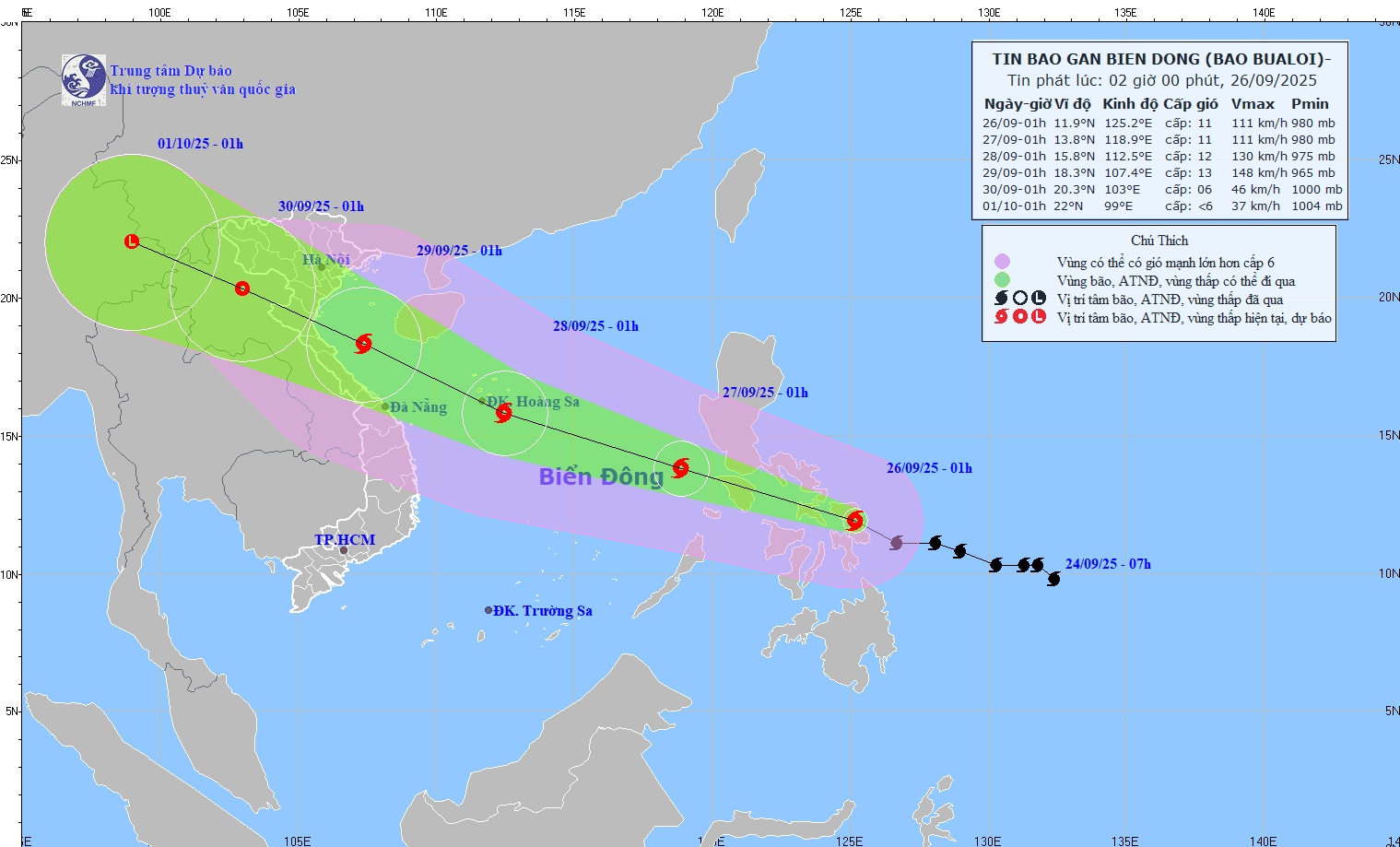 Dự báo khoảng đêm 26/9, bão Bualoi sẽ đi vào vùng biển phía Đông khu vực Giữa Biển Đông, trở thành cơn bão 10 năm 2025.