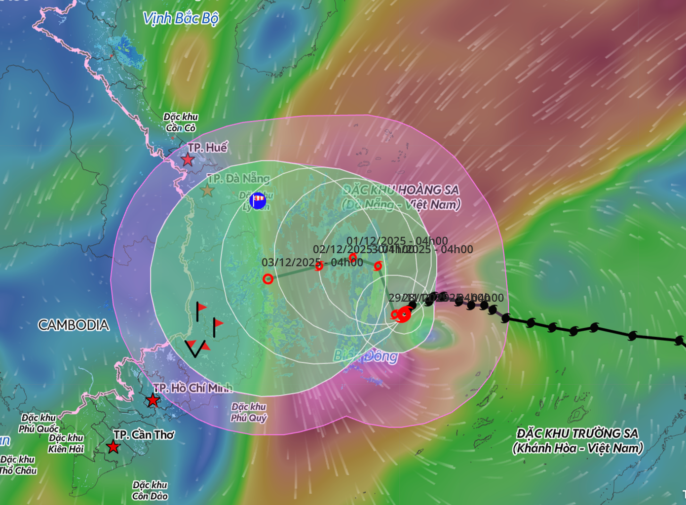 Đến 4 giờ ngày 29/11, bão di chuyển theo hướng Tây với tốc độ khoảng 3 km/h. Vị trí tâm bão ở 12,8°N – 112,4°E, trên vùng biển phía Tây khu vực Giữa Biển Đông, cách đảo Song Tử Tây khoảng 260 km về phía Tây Bắc. Cường độ bão suy yếu dần, còn cấp 10, giật cấp 14. Vùng nguy hiểm nằm trong khoảng vĩ tuyến 11,0°N – 15,0°N và kinh tuyến 111,0°E – 115,5°E. Cấp độ rủi ro thiên tai: cấp 3 đối với khu vực Giữa Biển Đông, bao gồm vùng biển phía Bắc đặc khu Trường Sa.