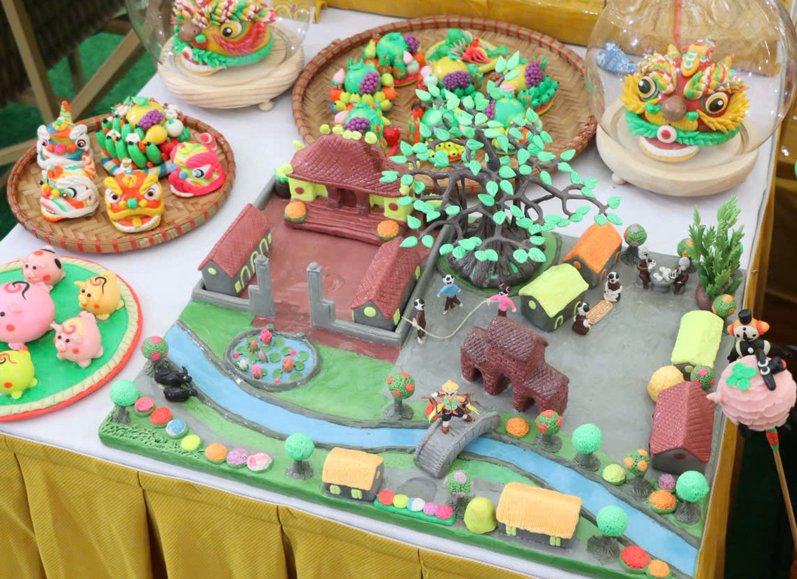Những con tò he do chính tay anh nặn được trang trí quanh khu vực anh ngồi, một góc nhỏ thôi nhưng chứa đựng cả tuổi thơ của biết bao thế hệ. Chúng tôi tròn mắt ngạc nhiên, nhìn xung quanh một lượt, nào là chú gà trống sặc sỡ với cái mào đỏ chót, siêu nhân với chiếc áo choàng phấp phới, nàng tiên cá có mái tóc dài,.. y hệt trong những bộ phim hoạt hình chúng tôi xem từ nhỏ, và cả mô hình làng quê mà anh vô cùng tâm đắc.