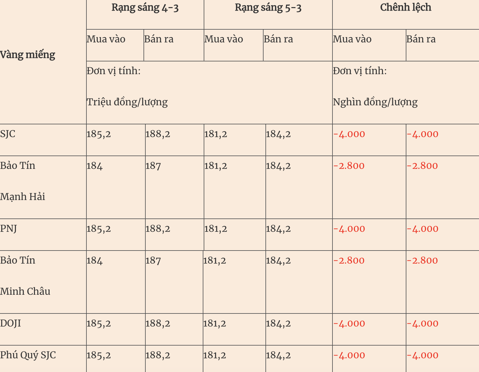 Ngoài ra, giá vàng miếng SJC tại Bảo Tín Mạnh Hải giao dịch ở mức 181,2 - 184,2 triệu đồng/lượng (mua - bán); giá vàng SJC tại Vàng bạc đá quý Phú Nhuận (PNJ) giao dịch ở mức 181,2 - 184,2 triệu đồng/lượng (mua - bán); giá vàng miếng SJC Hà Nội tại Vàng bạc đá quý Asean giao dịch ở mức 181,2 - 184,2 triệu đồng/lượng (mua - bán);...