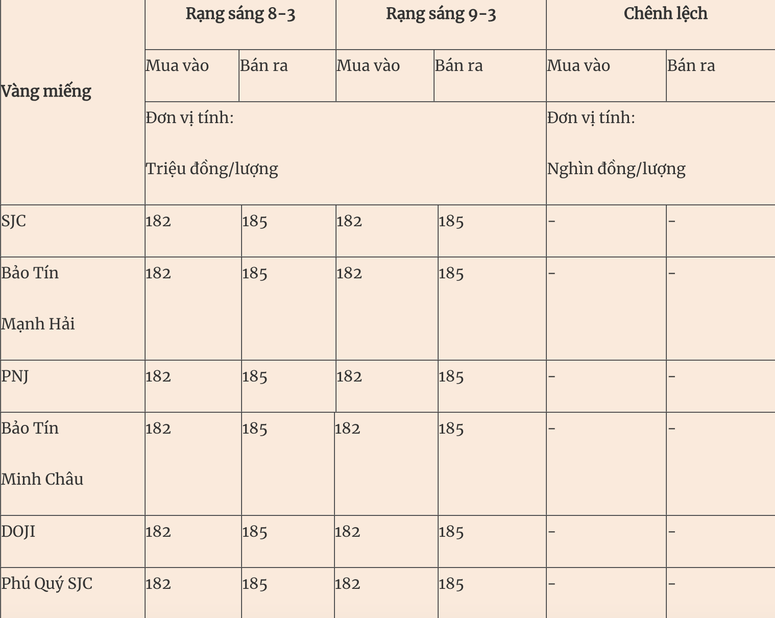 Cùng thời điểm, giá vàng miếng SJC tại Công ty Vàng bạc đá quý Mi Hồng niêm yết ở ngưỡng 182,3-185 triệu đồng/lượng, giảm 1,7 triệu đồng chiều mua vào và giảm 1,5 triệu đồng chiều bán ra so với tuần trước (184–186,5 triệu). Chênh lệch giá vàng ở mức 2,7 triệu đồng.