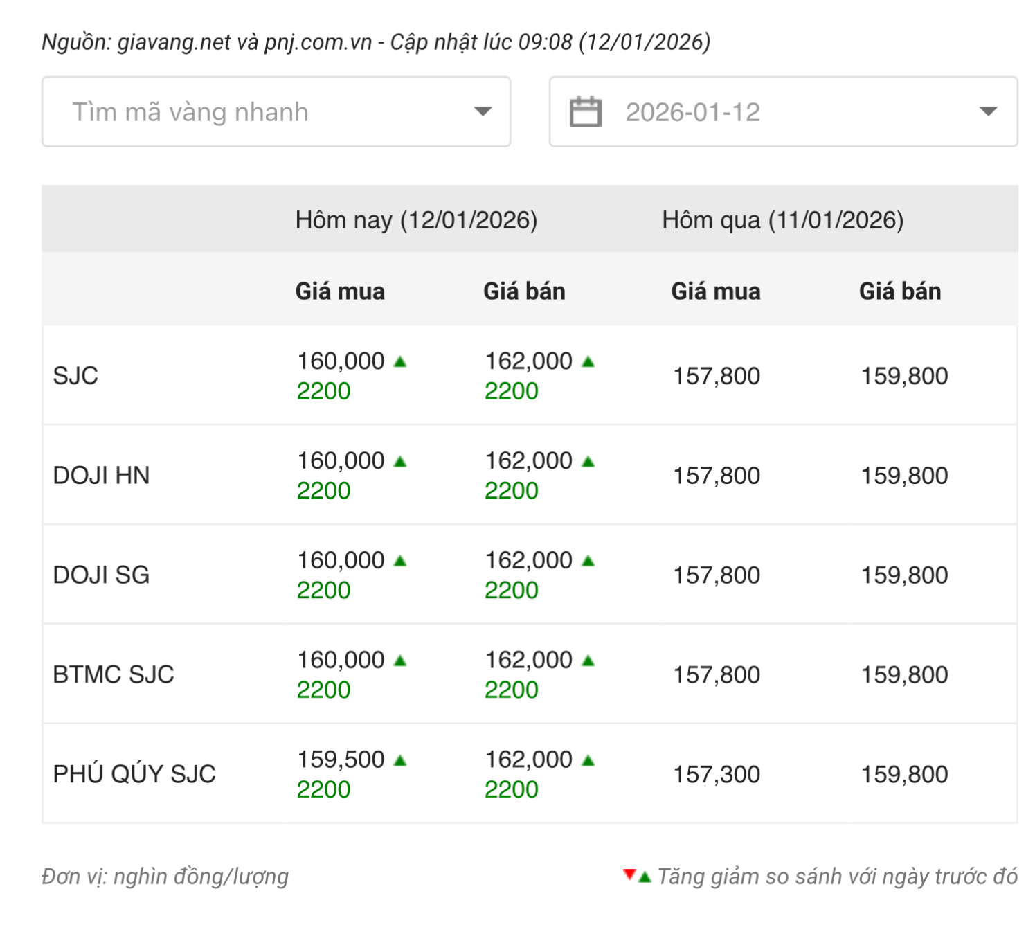 (THPL) - Giá vàng thế giới hôm nay 12/1, giao ngay ở mức 4.578,13 USD/ounce. Trong nước, giá vàng SJC tăng mạnh so với cuối phiên ngày hôm qua, bán ra đạt 162 triệu đồng/lượng.