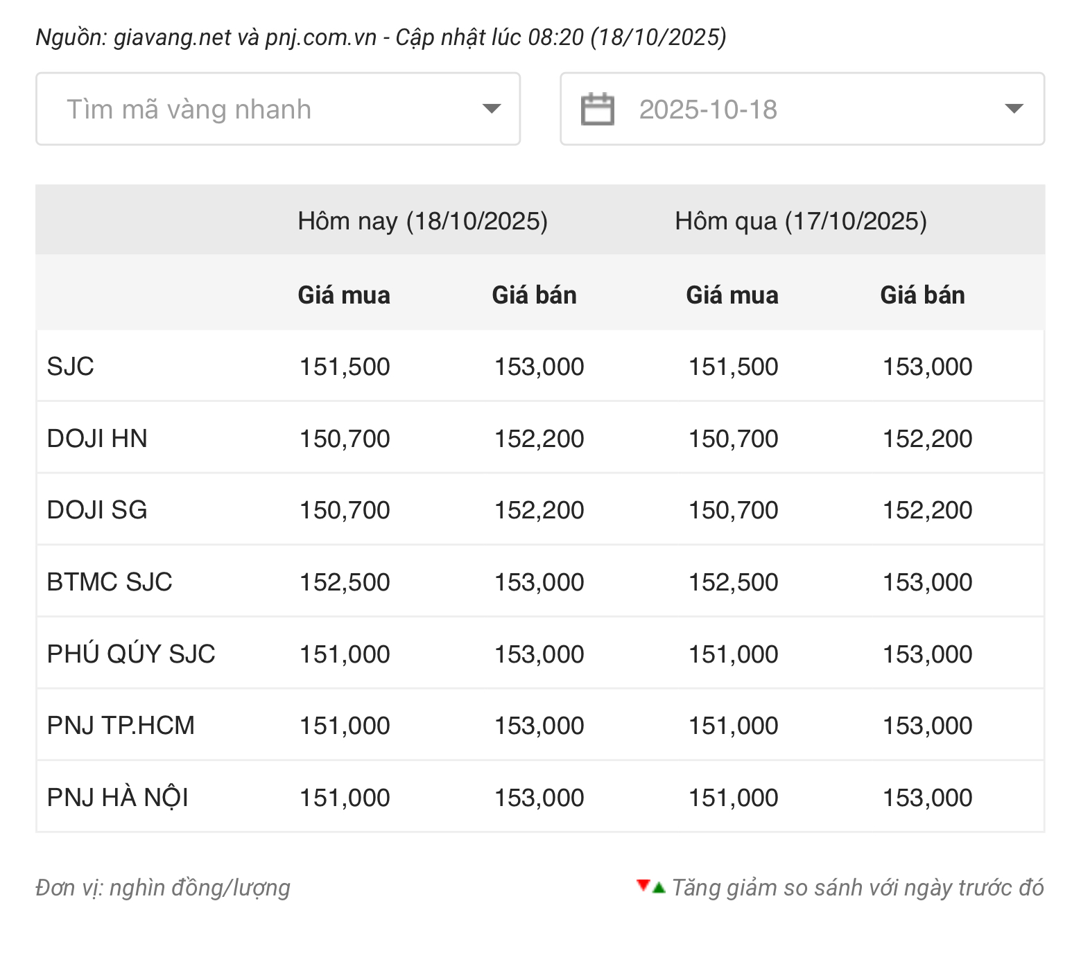 (THPL) - Giá vàng thế giới hôm nay 18/10, giao ngay ở mức 4.249,94 USD/ounce. Trong nước, giá vàng SJC tạm giữ giá với cuối phiên ngày hôm qua, bán ra khoảng 153 triệu đồng/lượng.