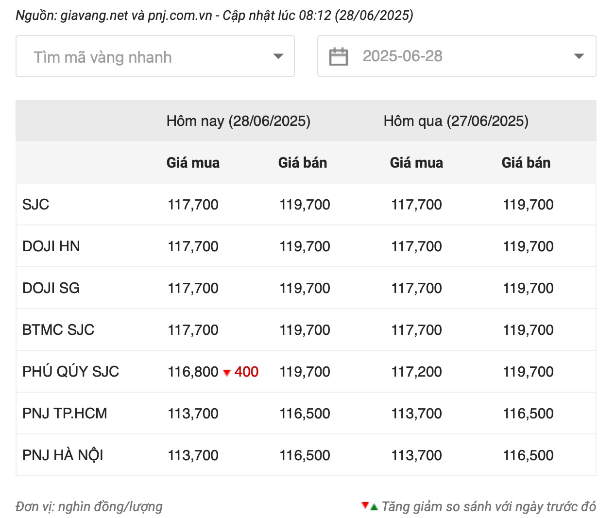 Thương hiệu vàng Phú Quý SJC hiện niêm yết ở mức 116,8 triệu đồng/lượng mua vào và 119,7 triệu đồng/lượng bán ra. Như vậy so với cuối phiên ngày hôm qua, thương hiệu này đã giảm 400 nghìn đồng/lượng ở chiều mua vào và giữ nguyên giá bán ra.