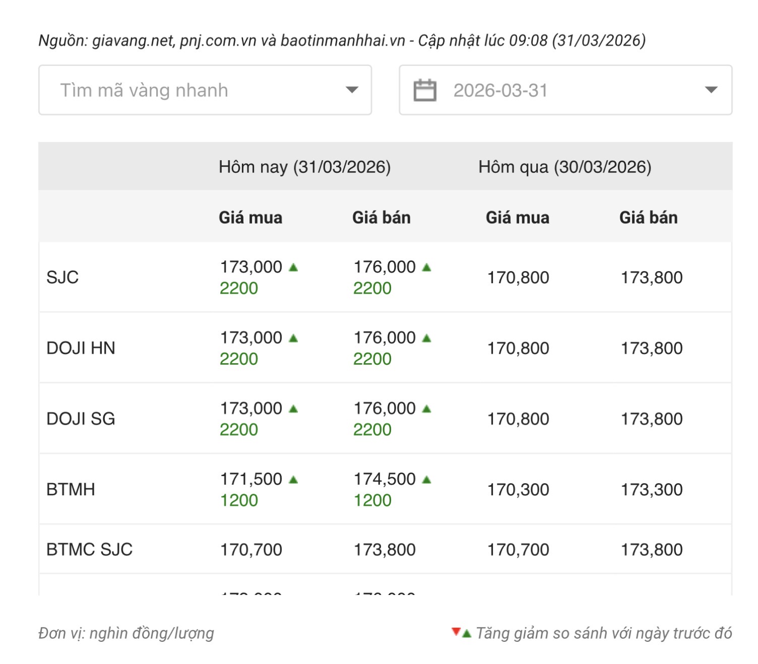 (THPL) - Giá vàng thế giới hôm nay 31/3, giao ngay ở mức 4.609,89 USD/ounce. Trong nước, giá vàng SJC tăng so với cuối phiên ngày hôm qua, bán ra khoảng 176 triệu đồng/lượng.