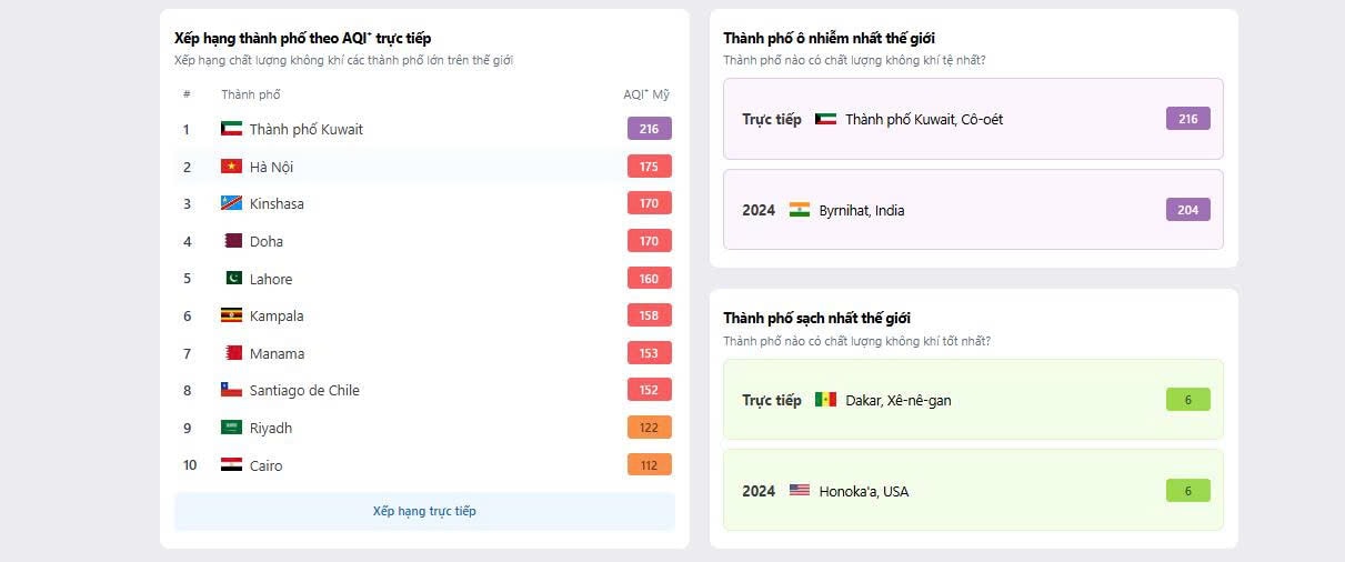 Cụ thể, vào lúc 7h30 sáng ngày 29/7/2025, hệ thống quan trắc không khí IQAir ghi nhận chỉ số AQI (chỉ số chất lượng không khí) của Hà Nội ở mức 180, xếp thứ 2 trong số 126 thành phố ô nhiễm trên thế giới. Đến 9h cùng ngày, chỉ số này được ghi nhận là 175, vẫn giữ nguyên vị trí thứ 2.