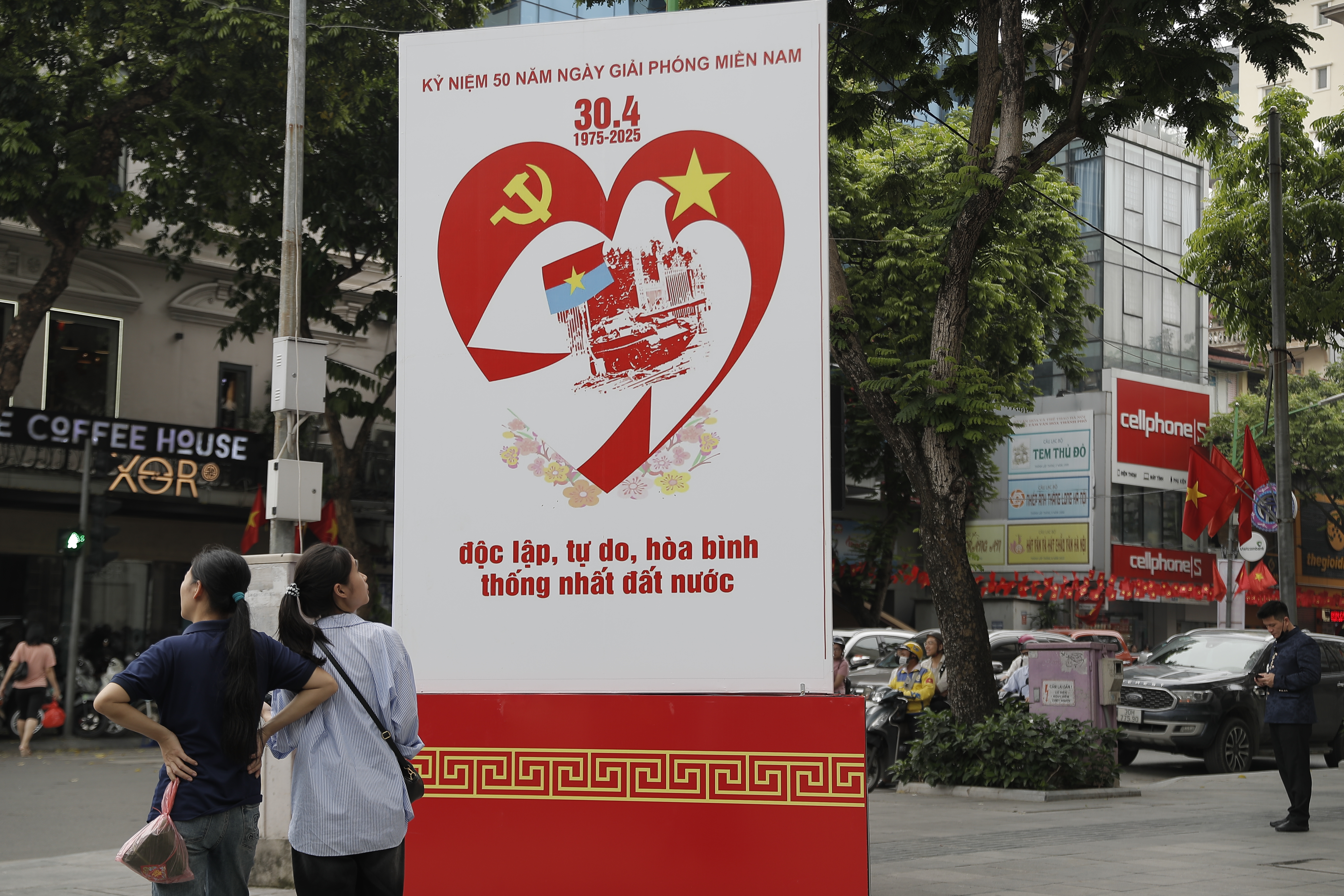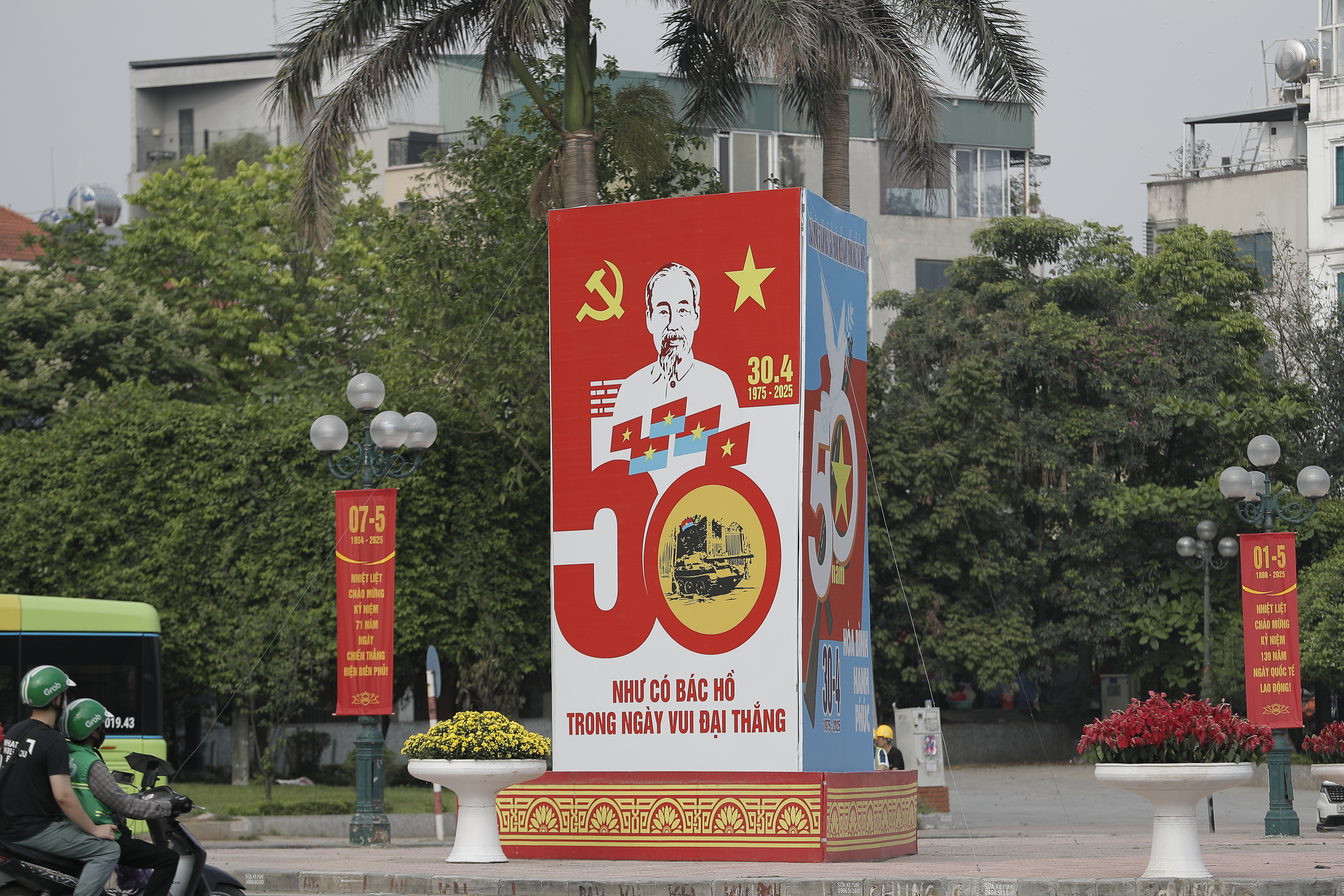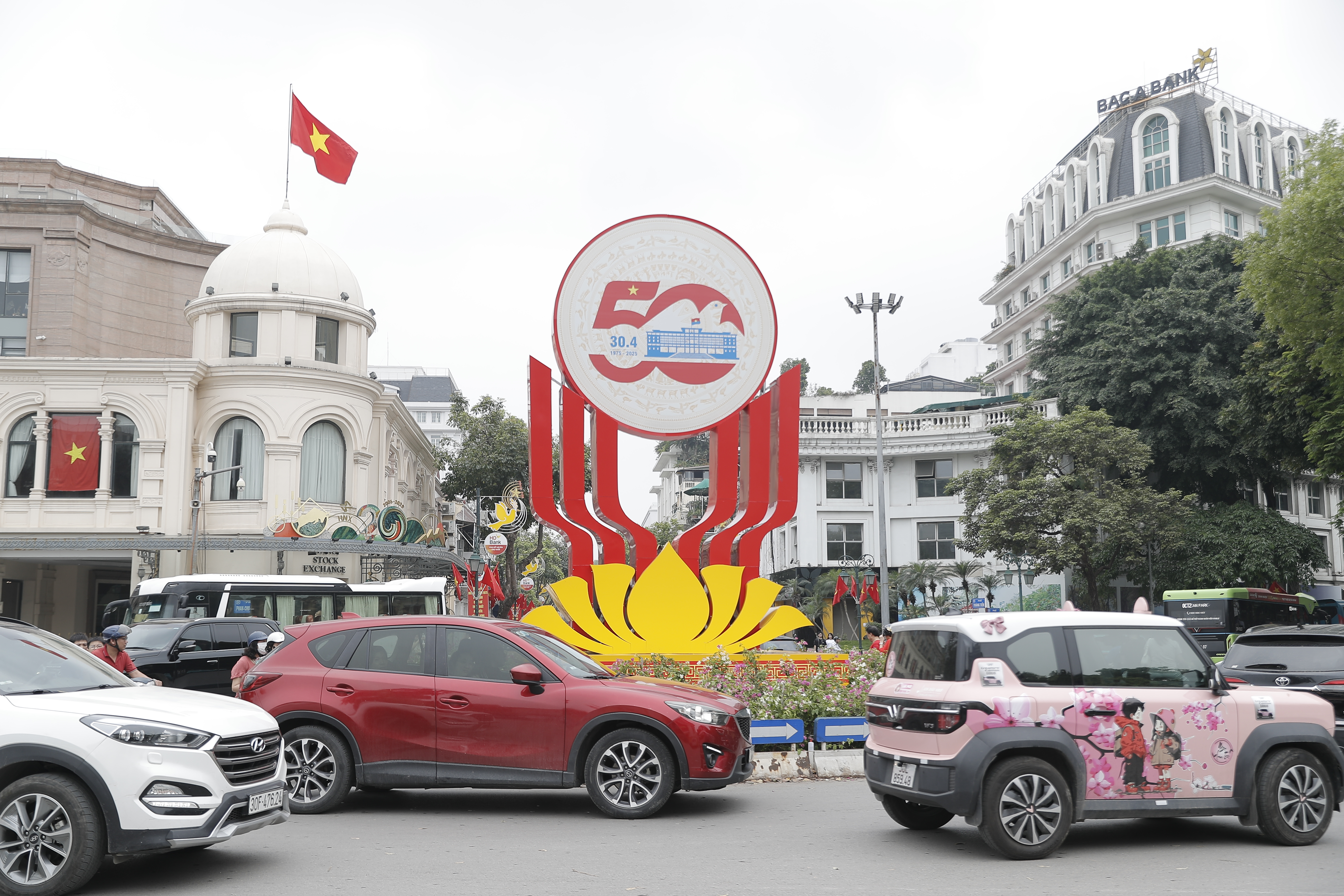 Hà Nội khoác lên mình màu áo mới với cờ hoa, pano rực rỡ, chào mừng kỷ niệm 50 năm Ngày Giải phóng miền Nam, thống nhất đất nước.