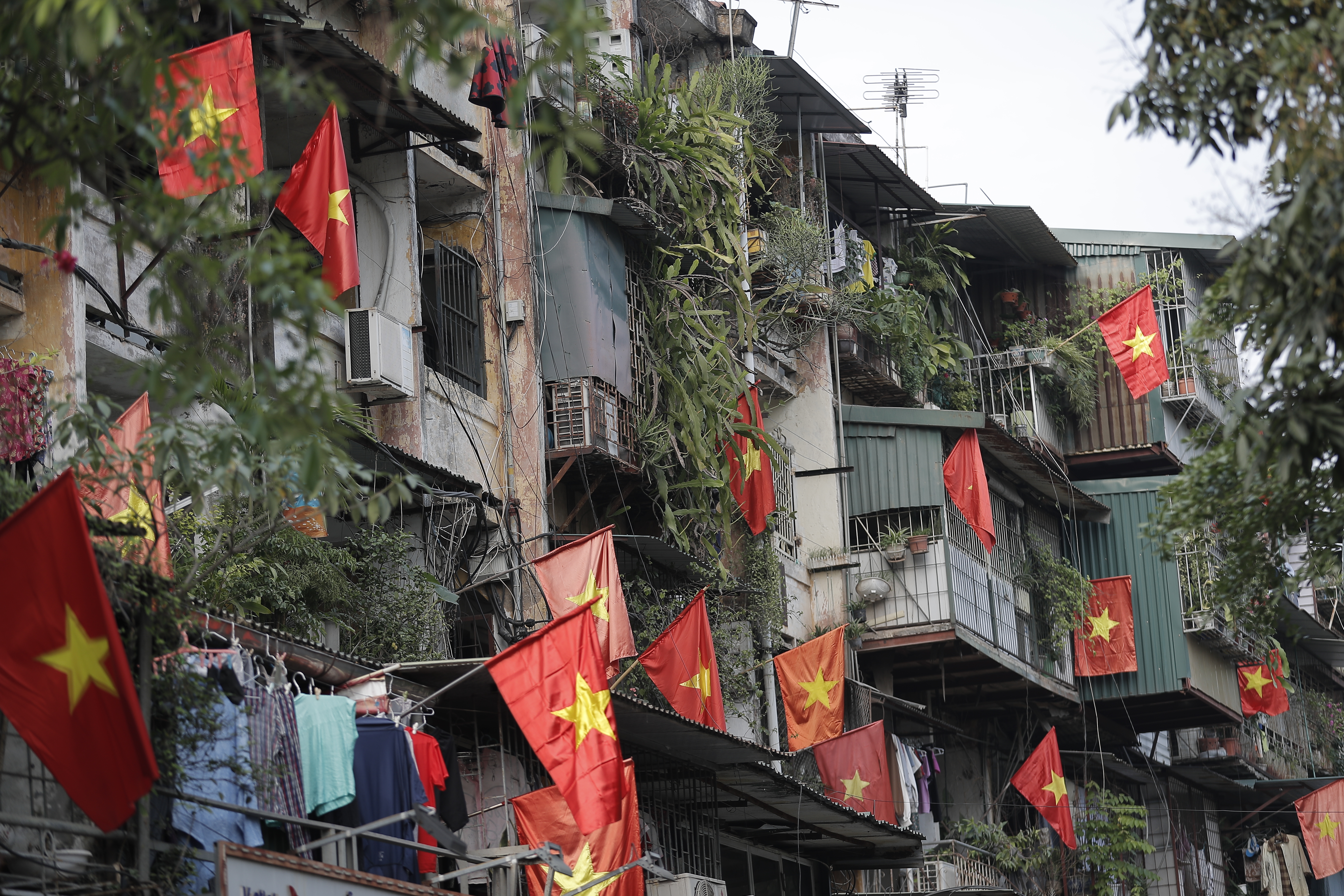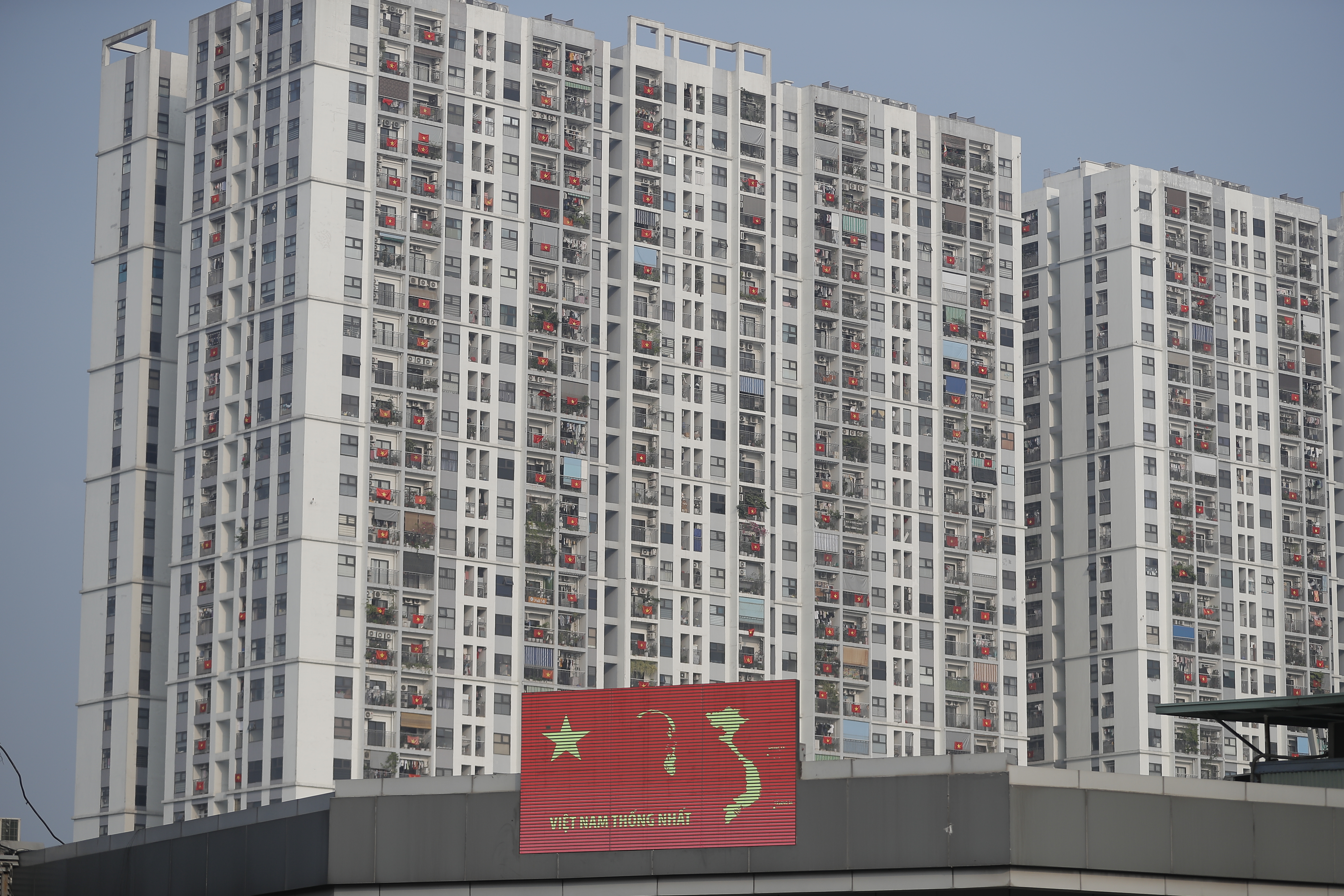 Nhiều chung cư, khu tập thể ở Hà Nội đồng loạt treo cờ Tổ quốc mừng 50 năm đất nước thống nhất.