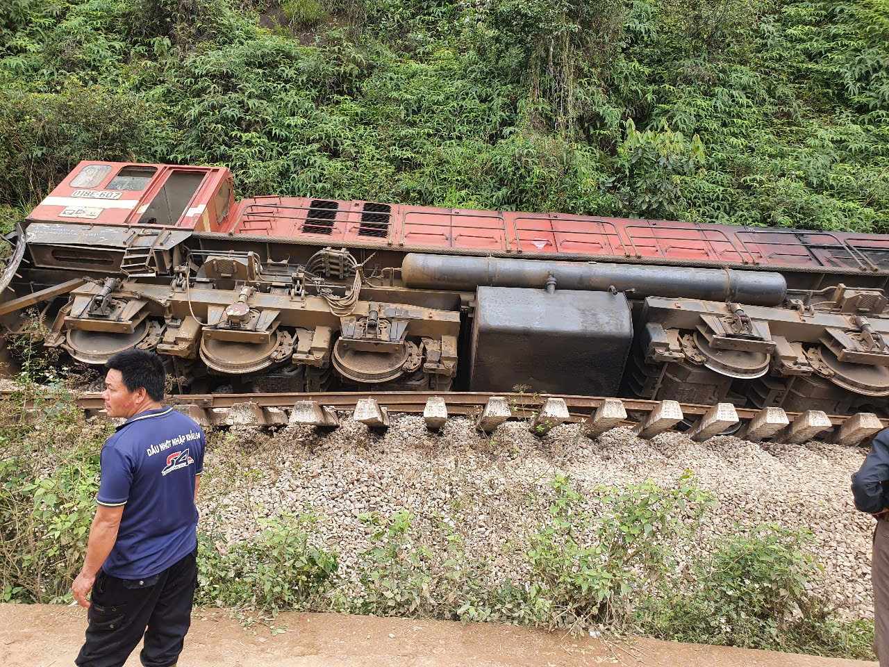 Hiện trường vụ tai nạn. Ảnh: Phan Châu Hậu quả, người lái tàu hàng bị thương; 1 đầu máy, 3 toa hàng và nhiều mét đường ray bị trật khỏi nền của tuyến đường sắt Bắc-Nam.