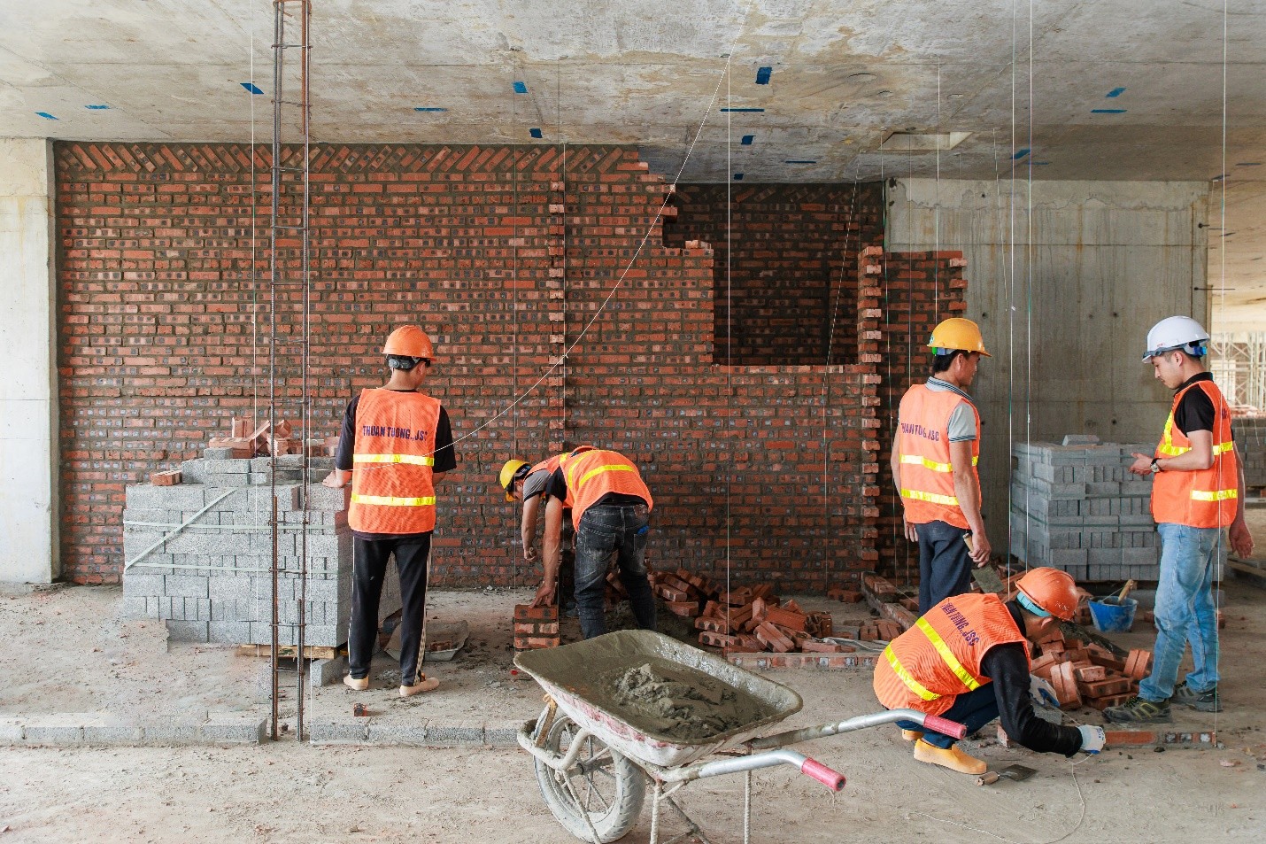 Từ giữa tháng 3, dự án triển khai xây tường, đánh dấu bước tiến mới trong quá trình hoàn thiện kết cấu.
