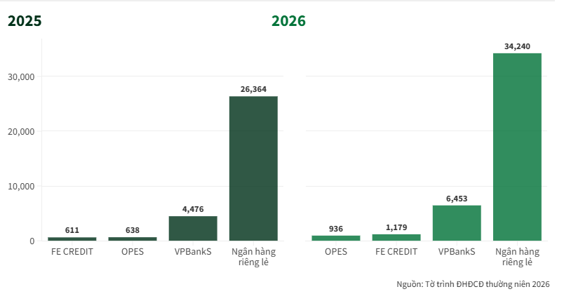 Theo kế hoạch dự kiến trình ĐHĐCĐ thường niên 2026, các trụ cột trong hệ sinh thái VPBank tiếp tục được kỳ vọng đóng vai trò dẫn dắt tăng trưởng. VPBankS dự kiến là đơn vị đóng góp lớn nhất với mục tiêu lợi nhuận năm nay đạt 6.453 tỷ đồng (tăng 44% so với thực hiện năm 2025), trong khi FE CREDIT đặt kế hoạch 1.179 tỷ đồng (tăng 93%), phản ánh kỳ vọng phục hồi mạnh mẽ sau tái cấu trúc. Ở mảng bảo hiểm, OPES cũng hướng tới 936 tỷ đồng lợi nhuận (tăng 47%), duy trì đà tăng trưởng cao.