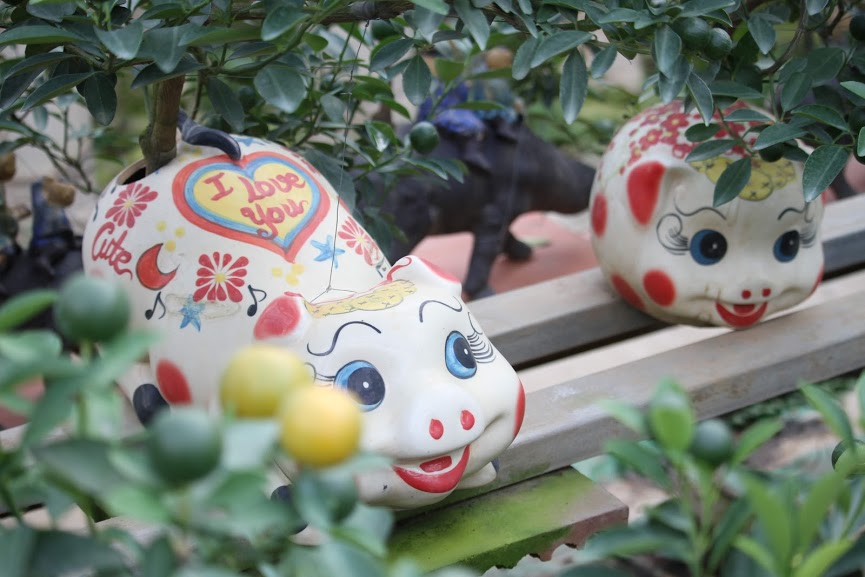 Tại đây, các nghệ nhân đã sáng tạo trồng quất bonsai với nhiều hình dáng độc đáo trên lưng các chú heo bằng sứ ngộ nghĩnh, ngầm thể hiện mong muốn một năm Hợi no đủ, ấm áp để đáp ứng thị hiếu người tiêu dùng.