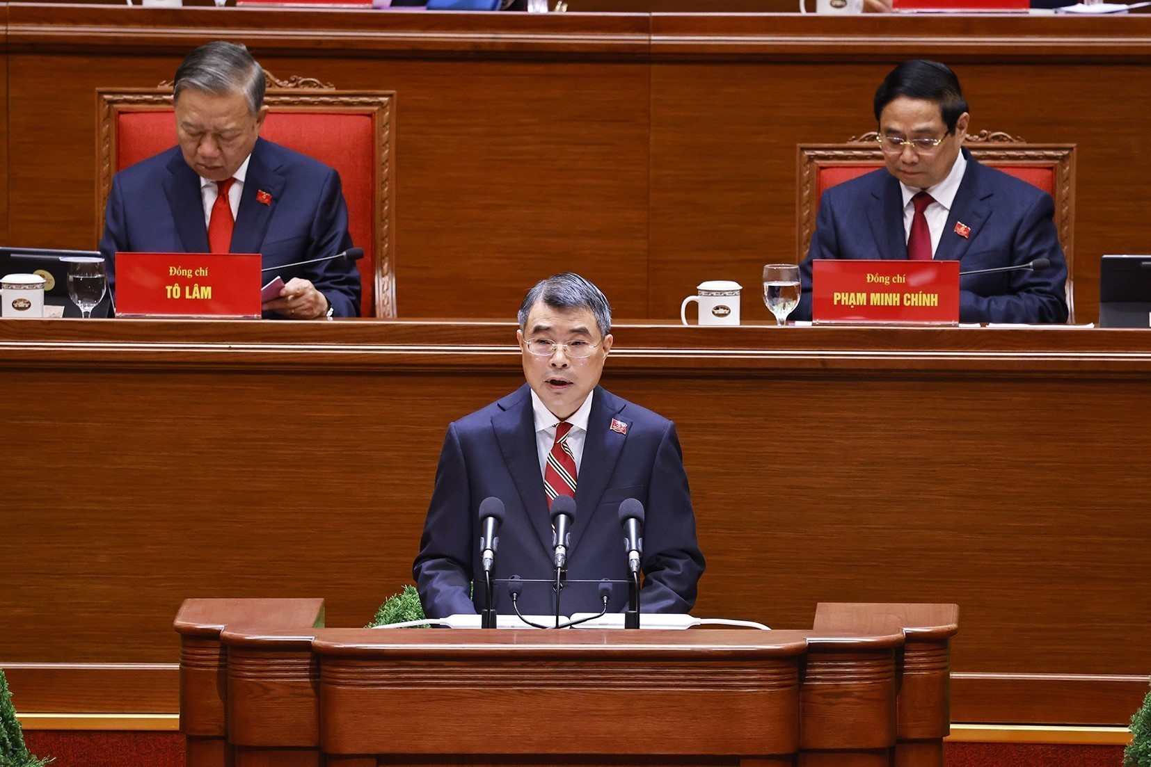 Tổng Bí thư Tô Lâm, Chủ tịch Đoàn Chủ tịch điều hành phiên họp. Ảnh: TTXVNĐồng chí Lê Minh Hưng, Trưởng Ban Tổ chức Trung ương thay mặt đoàn Chủ tịch trình bày báo cáo của Ban chấp hành Trung ương Đảng khóa 13 về công tác nhân sự Ban chấp hành Trung ương Đảng khóa 14. Ảnh: TTXVNĐồng chí Phạm Gia Túc, Uỷ viên Trung ương Đảng, Chánh Văn phòng Trung ương Đảng thay mặt Đoàn Thư ký trình bày chương trình làm việc tại Đại hội. Ảnh: TTXVNĐại hội biểu quyết thông qua danh sách bầu BCH Trung ương Đảng khóa XIV. Ảnh: TTXVNĐoàn đại biểu Đảng bộ Quân đội biểu quyết thông qua danh sách bầu cử BCH Trung ương Đảng khóa XIV. Ảnh: TTXVNTổng Bí thư Tô Lâm và các đồng chí lãnh đạo Đảng, Nhà nước bỏ phiếu bầu BCH Trung ương Đảng khóa XIV. Ảnh: TTXVNCác đại biểu bỏ phiếu bầu BCH Trung ương Đảng khóa XIV. Ảnh: TTXVNCác đại biểu dự Đại hội, chiều 22/1. Ảnh: TTXVNĐại biểu Đảng bộ Công an Trung ương dự phiên họp. Ảnh: TTXVN