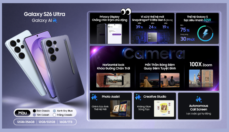 Về tuỳ chọn, Galaxy S26 Series có các màu Đen, Xanh, Tím, Trắng, đi kèm hai cấu hình bộ nhớ 12GB/256GB và 12GB/512GB.