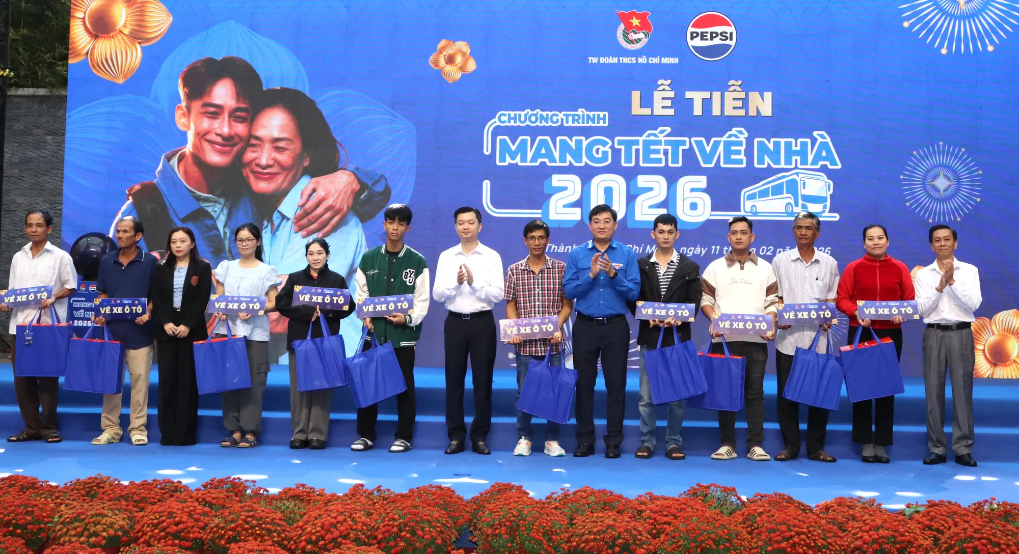 (THPL) - Sáng 11/2, tại Nhà Văn hóa Thanh niên TP. HCM, Trung ương Đoàn TNCS Hồ Chí Minh phối hợp cùng nhãn hàng Pepsi (Công ty TNHH Nước Giải khát Suntory PepsiCo Việt Nam) tổ chức tiễn sinh viên, thanh niên công nhân lao động có hoàn cảnh khó khăn tham gia chương trình "Mang Tết về nhà" năm 2026.