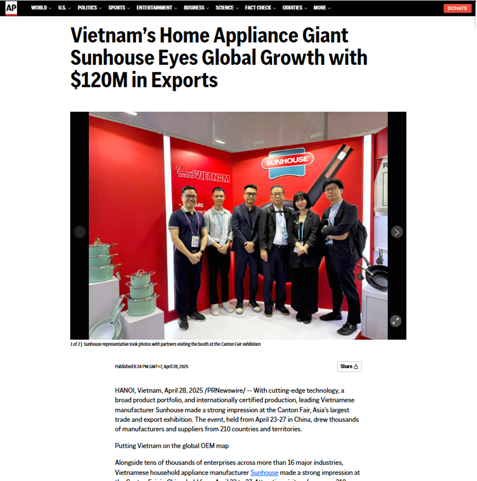 “Sunhouse - gã khổng lồ gia dụng Việt đặt mục tiêu tăng trưởng toàn cầu, xuất khẩu 120 triệu USD” là tiêu đề bài viết đăng tải trên AP News hôm 28/4. AP News là một trong những hãng thông tấn tuổi đời 2 thập kỷ có trụ sở tại New York, Mỹ, gây dựng danh tiếng trong giới báo chí toàn cầu bởi tính độc lập, khách quan và độ tin cậy cao, có độc giả từ hơn 200 quốc gia, vùng lãnh thổ trên thế giới.