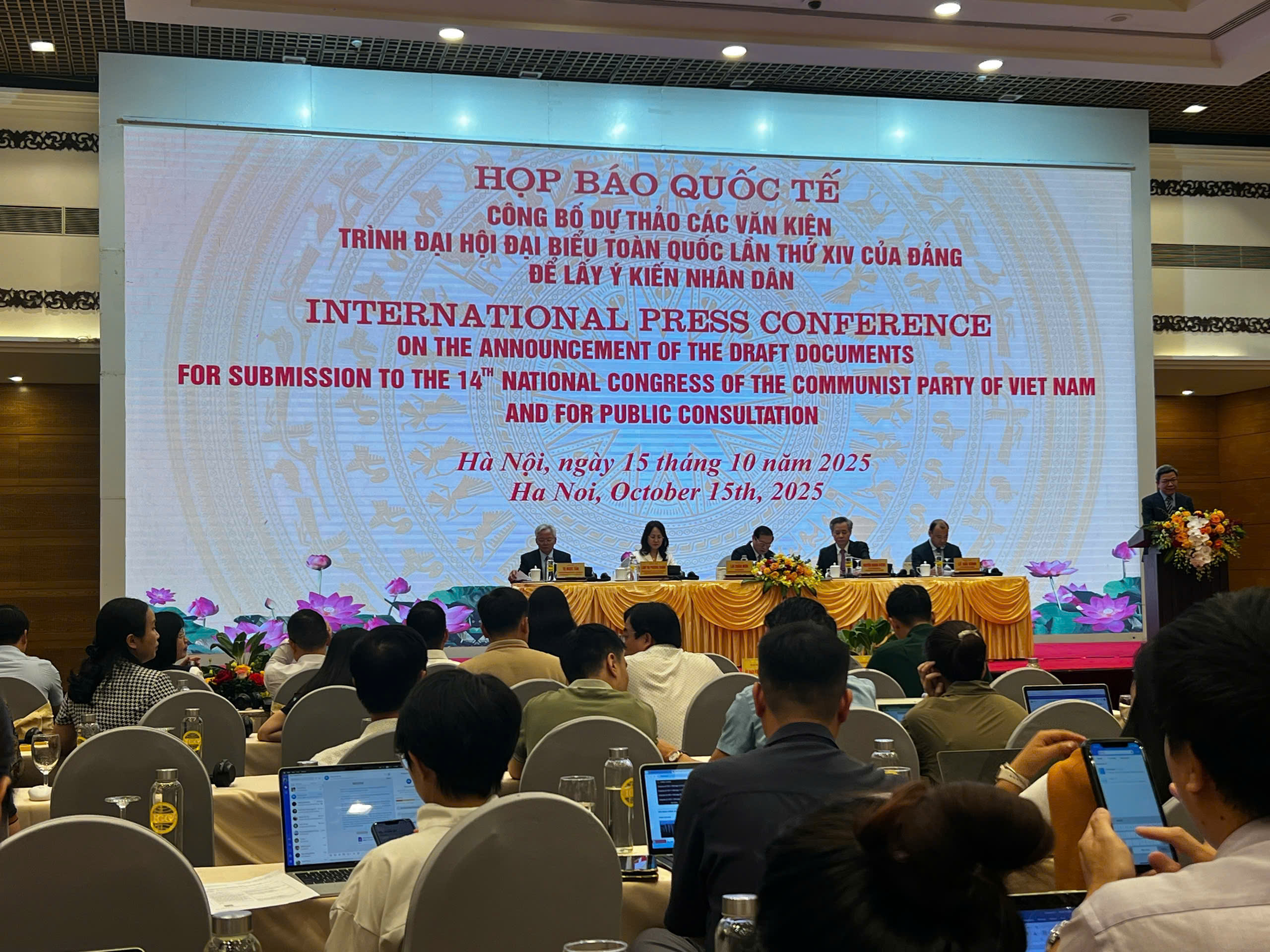 Tham dự buổi họp báo chiều 15/10 có các đồng chí: Lại Xuân Môn, Ủy viên Trung ương Đảng, Phó Trưởng ban Thường trực Ban Tuyên giáo và Dân vận Trung ương; Lâm Thị Phương Thanh, Ủy viên Trung ương Đảng, Phó Chánh Văn phòng Thường trực Văn phòng Trung ương Đảng Cộng sản Việt Nam; Nguyễn Quang Dương, Ủy viên Trung ương Đảng, Phó Trưởng Ban Tổ chức Trung ương; Tạ Ngọc Tấn, Phó Chủ tịch Thường trực Hội đồng Lý luận Trung ương, Tổ phó Thường trực Tổ Biên tập Văn kiện Đại hội XIV; Lê Hải Bình, Ủy viên dự khuyết Trung ương Đảng, Thứ trưởng Thường trực Bộ Văn hóa, Thể thao và Du lịch.