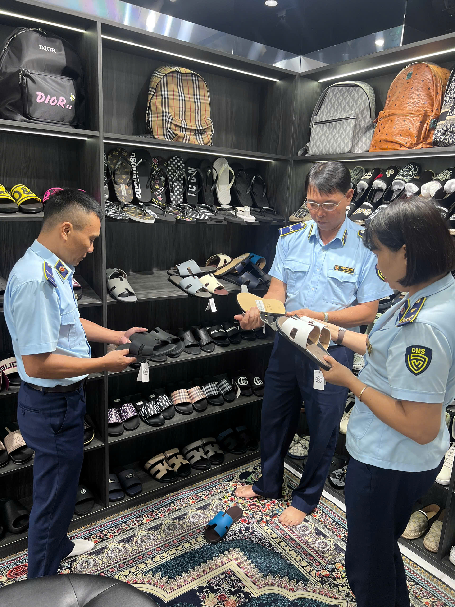 Kiểm tra tại cửa hàng Phương Hà Luxury (địa chỉ: Số 258, đường Trần Hưng Đạo, phường Trần Hưng Đạo), lực lượng QLTT phát hiện tang vật gồm 12 đôi dép giả mạo nhãn hiệu Hermes, có trị giá theo giá niêm yết tại cửa hàng: 6.600.000 đồng.