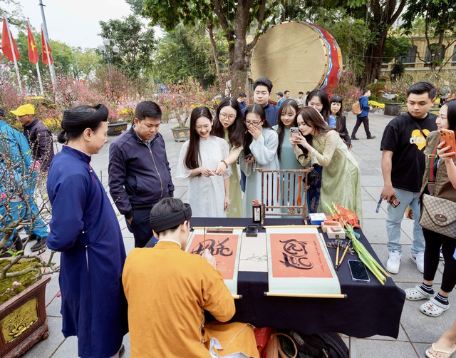 Du khách trải nghiệm xin chữ đầu xuân tại Không gian hoa xuân Lý Thái Tổ ở Hà Nội dịp Tết Nguyên đán Bính Ngọ 2026. Ảnh: VGP