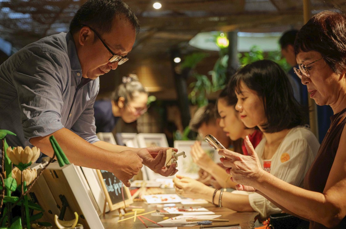 Ngoài ra, sự kiện còn mang đến trải nghiệm nghệ thuật thủ công với workshop "tranh giấy xoắn", một hình thức khảm tranh bằng sợi giấy xoắn độc đáo cùng nghệ nhân Võ Xuân Hùng, giảng viên Trường cao đẳng Giao thông vận tải, người đã đam mê và dành tình yêu cho nghệ thuật.
