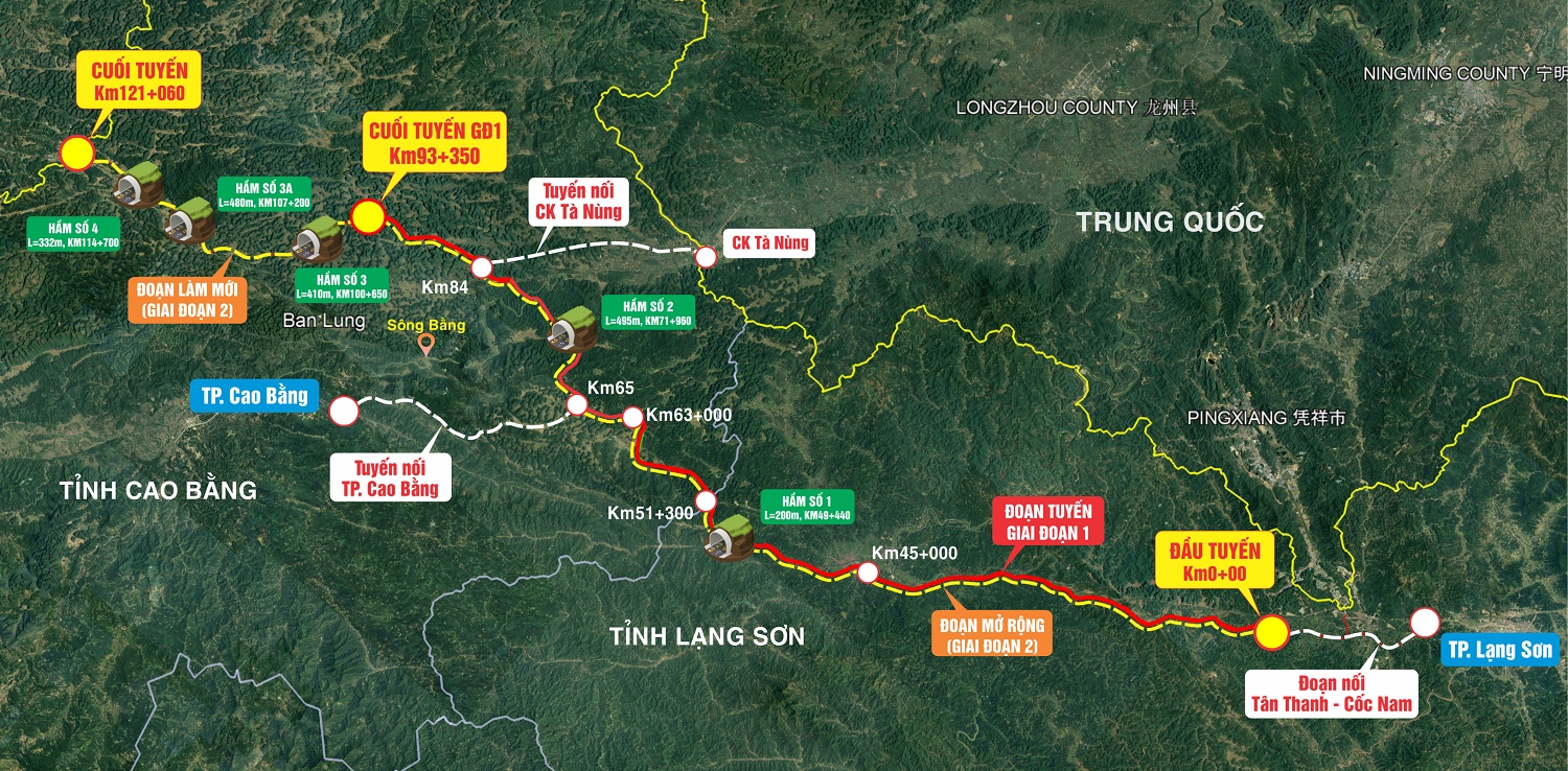 Cao tốc Đồng Đăng - Trà Lĩnh có tổng chiều dài 121 km, được phân kỳ đầu tư thành 2 giai đoạn với tổng mức đầu tư gần 23.000 tỷ đồng. Giai đoạn 1 của dự án được khởi công vào ngày 1/1/2024, với chiều dài 93,35 km, bao gồm 2 hầm xuyên núi và 64 cây cầu vượt.